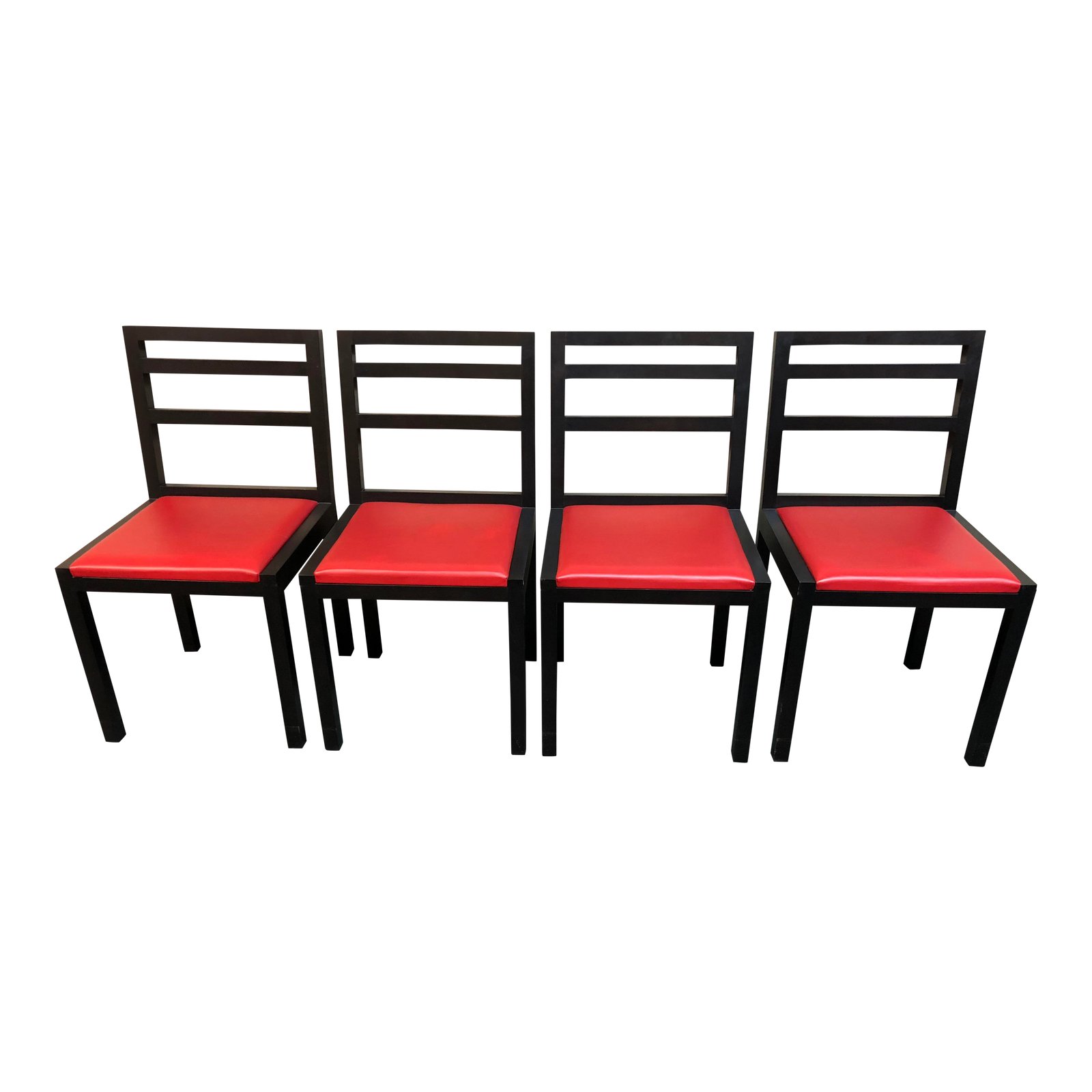 Design Plus Gallery presents a Set of Four Black + Red Dining Chairs. The backrests sport a slight curved beveling which can be appreciated once seated but does not detract from the rigid hard lines of the design. Red faux leather is firmly upholstered. Pieces are sturdy, and in good condition with little signs of wear.