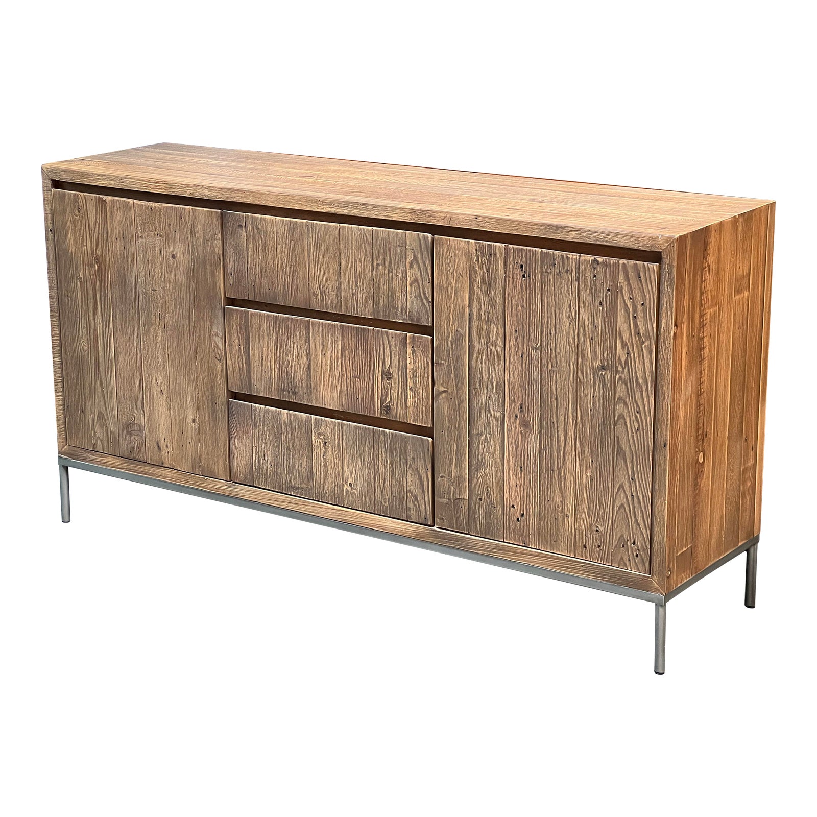 Design Plus Gallery presents a Modern Farmhouse Sideboard. The clean lined silhouette is clad in wide plank wood with a washed and rustic finish. Three center drawers are flanked by push-to-open doors that open to storage shelves. The cabinet is elevated on natural steel base. Light surface wear, condition is consistent with age and use.