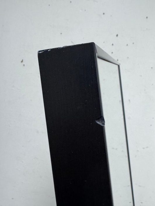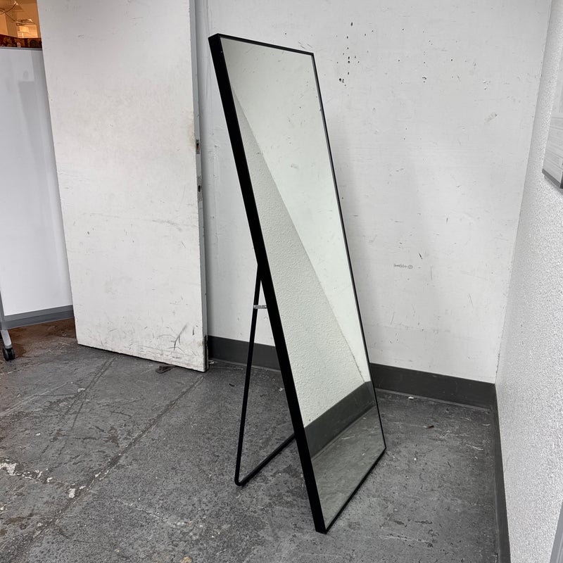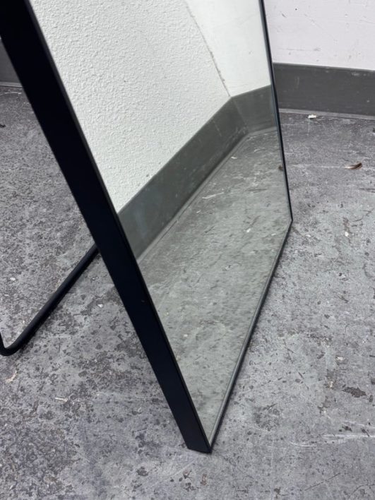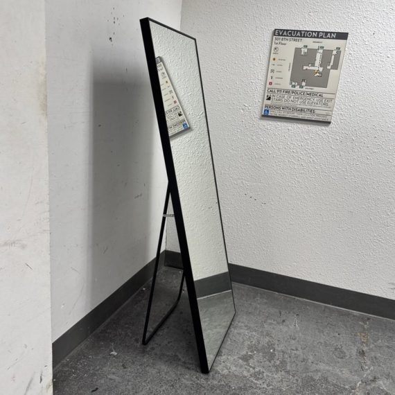 Design Plus Gallery presents a Wall Mirror with Rectangular Shape + Metal Frame. The mirror offers a kick stand to use on level ground, can be leaned or even hung with its metal mounting hooks on the backside. Is in good condition with minimal wear for its usage.
