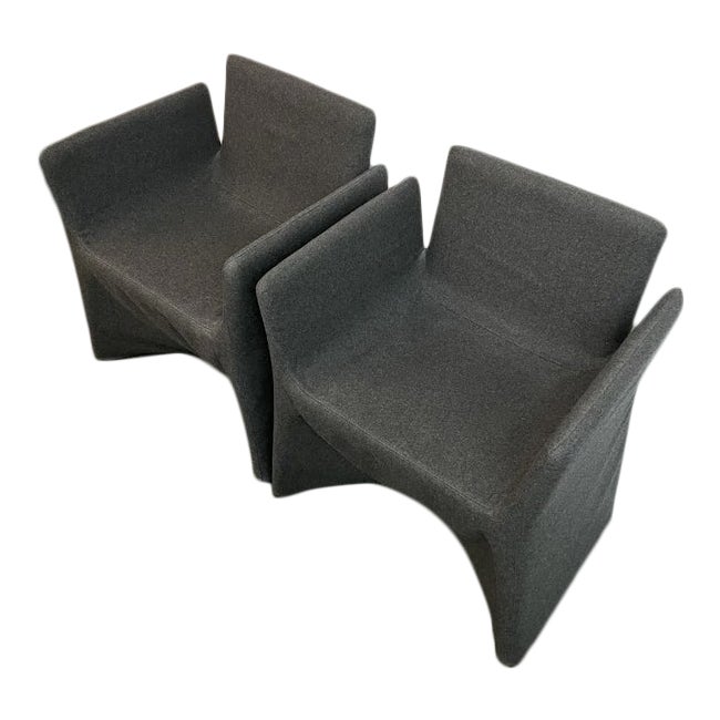 Design Plus Gallery presents a pair of Arflex Arm Chairs. Each of the two modern, flared- arm chair is strapped snuggly into a gray felt sheath, keeping the silhouette crisp and edgy. Soft to the touch and easy on the eye, the pair are scaled to be useful in many settings. Made in Italy