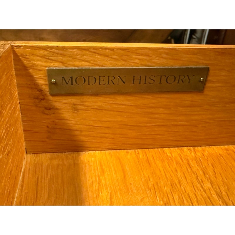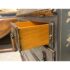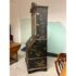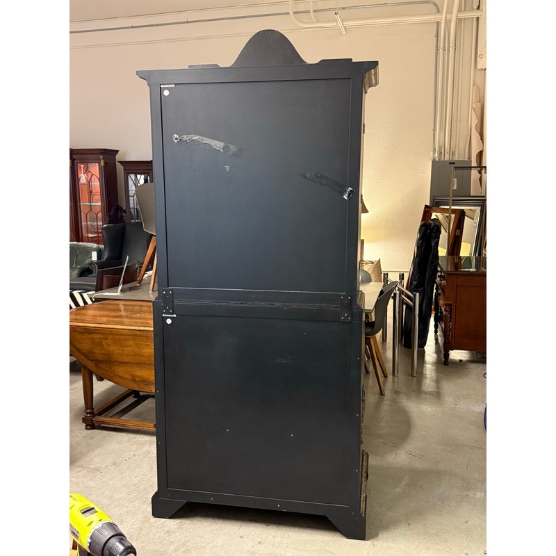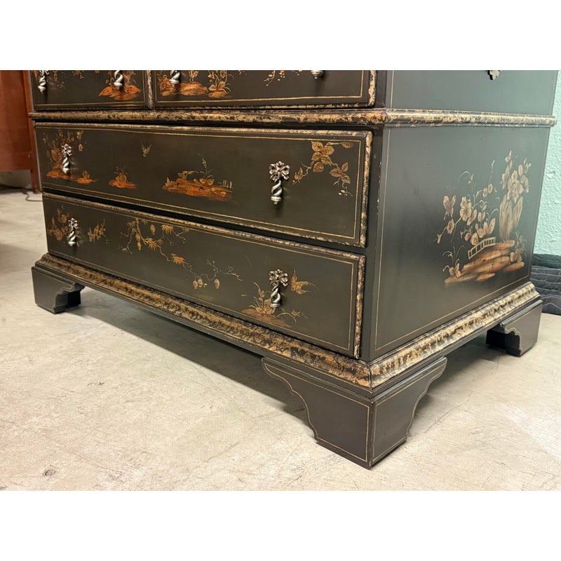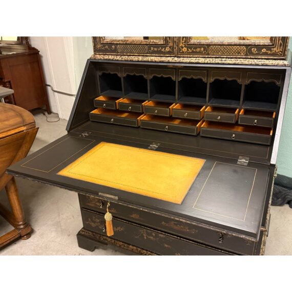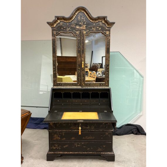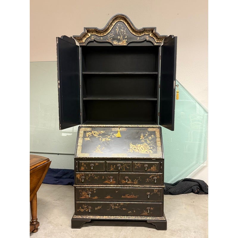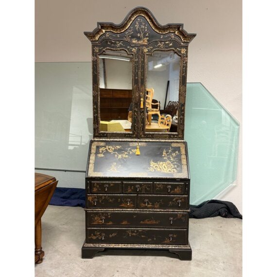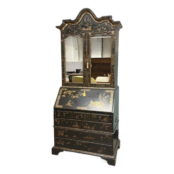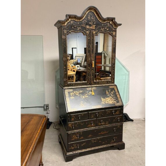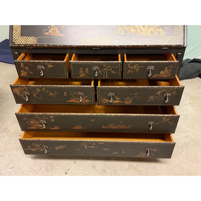 Design Plus Gallery presents a Chinoiserie Secrétaire of from Modern History. Their brand is hand-crafted in small quantities, the quality of manufacture, finish, proportion and attention to detail are reminiscent of generations past when anything less would not be tolerated. The vintage to antique secrétaire is in a dark finish with hand painted gold chinoiserie scenes on every side of the piece except the back. The bottom cabinet has seven drawers total with three third width size on the top, two half width size in the middle, and two rows of full width drawers at the base. The upper portion of its base is filled to the brim with cubbies + tiny drawers when the top is pulled down revealing the leather padded writing surface. The upper portion offers to antiqued mirrored doors with three shelves held within. Classic, timeless, well-styled and quality is the foundation for its exceptional design. Overall the piece is in good condition for its age with minimal surface wear consistent with use.