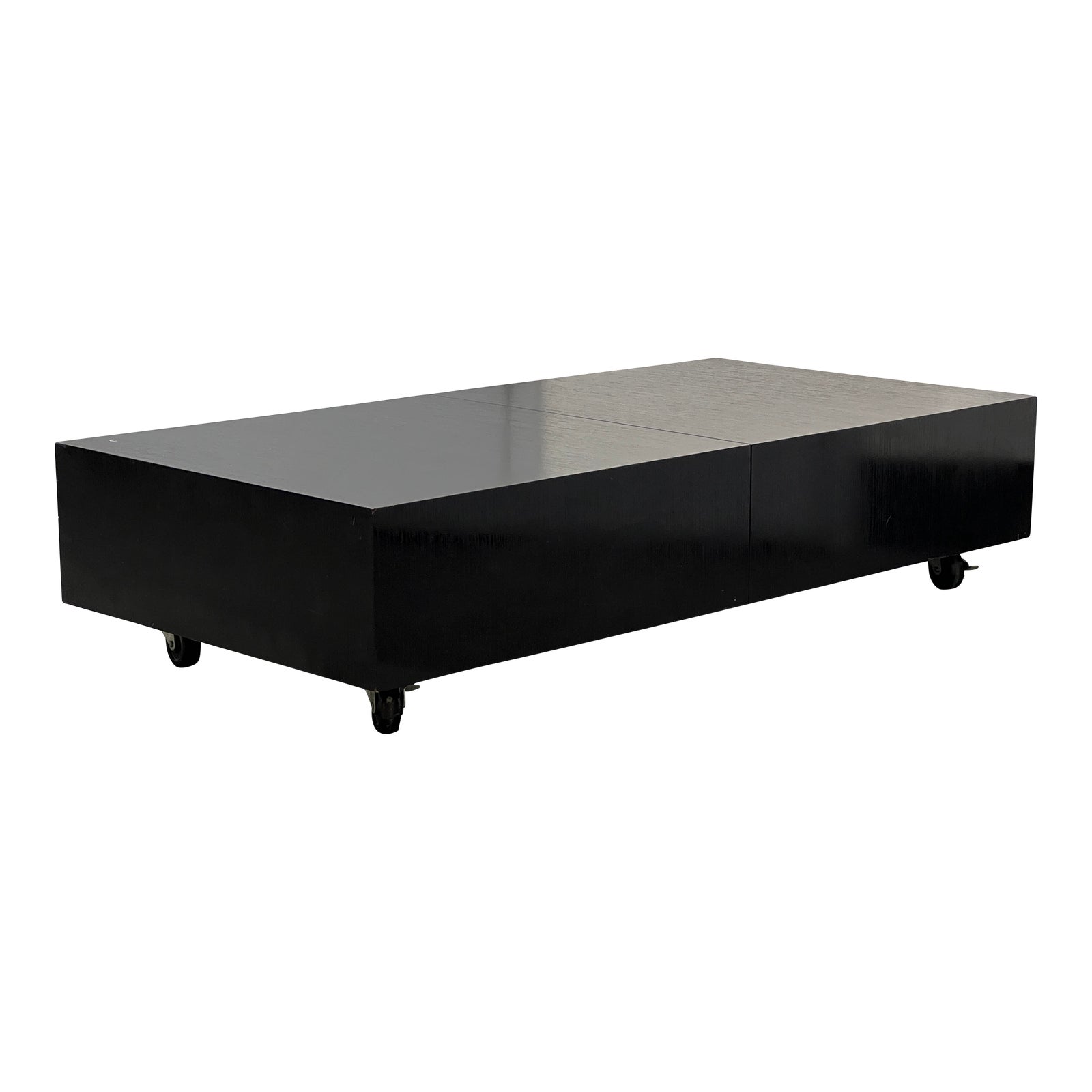 Design Plus Gallery presents a Low Modern Style Coffee Table. Easy for mobility, there is casters on the base. The coffee table can be pulled on the opposite direction to reveal inner storage with cubbies. The frame is a black finish veneer. Visible and minor wear from usage.