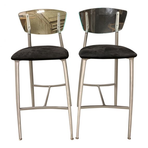 Design Plus Gallery presents a pair of Modern Lucite + Aluminum + Upholstered Bar Stools. Elegant Aluminum frame complete with foot rest gives light silver base to open Lucite backs and black micro fiber upholstered seats. Light wear on frame and seats.