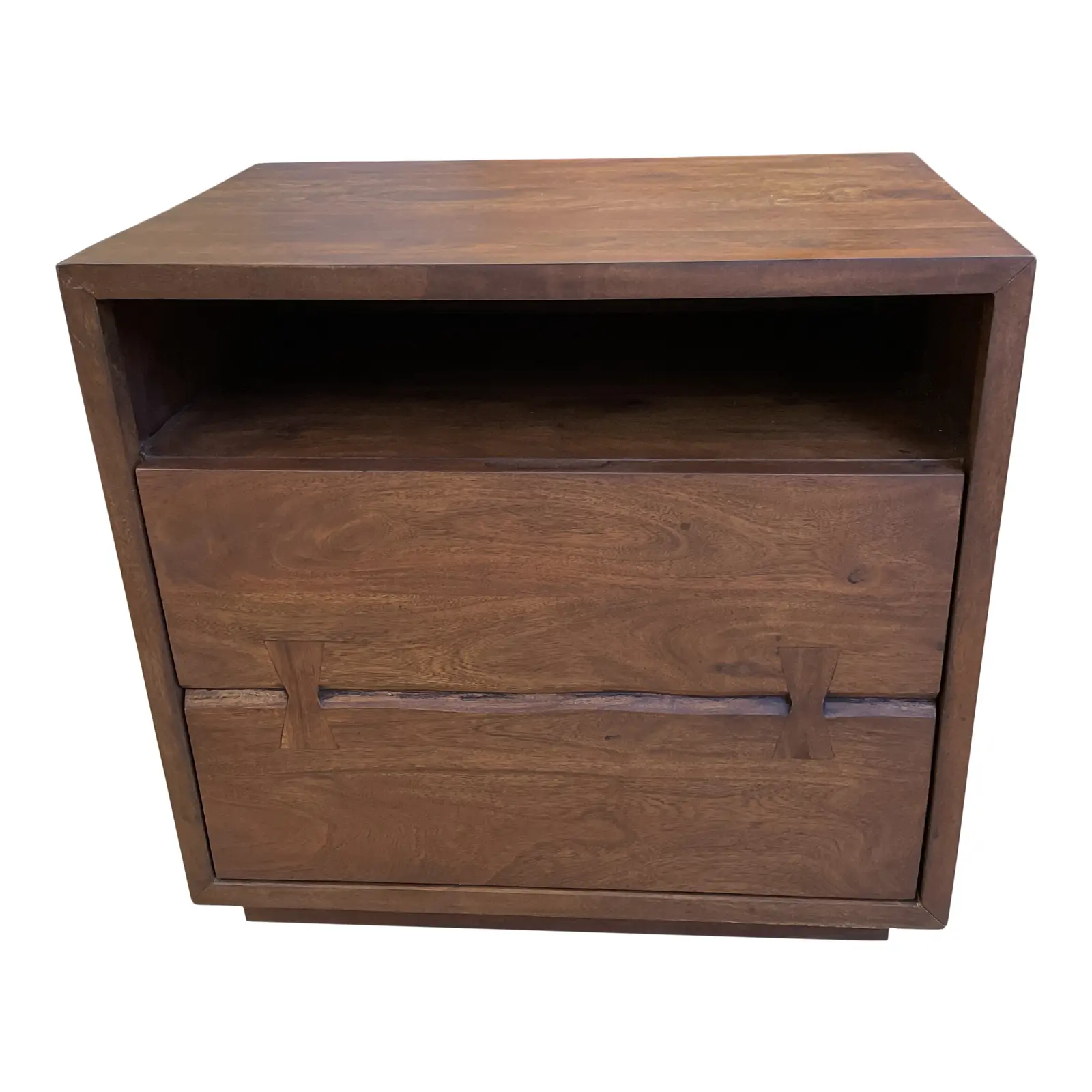 Design Plus Gallery presents a Modern Organic Nightstand. Chestnut stain is applied to the sleek + sharp lines and gives a rich depth to the wood grain. Lower drawer is spacious and has a dovetail style front with live edge detail. Minor wear through out, good condition. Made in India.