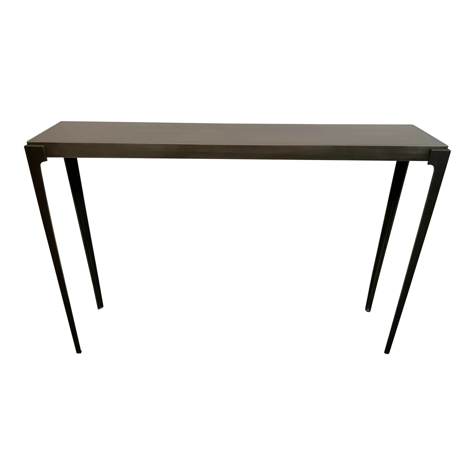 Design Plus Gallery presents a Modern Metal Console Table. Slim in silhouette, the simple table is tall in statue. The brushed bronze surface appears to be wedged between the four tapered legs. Beautiful style, great function for a narrow space, hallway or sofa back.