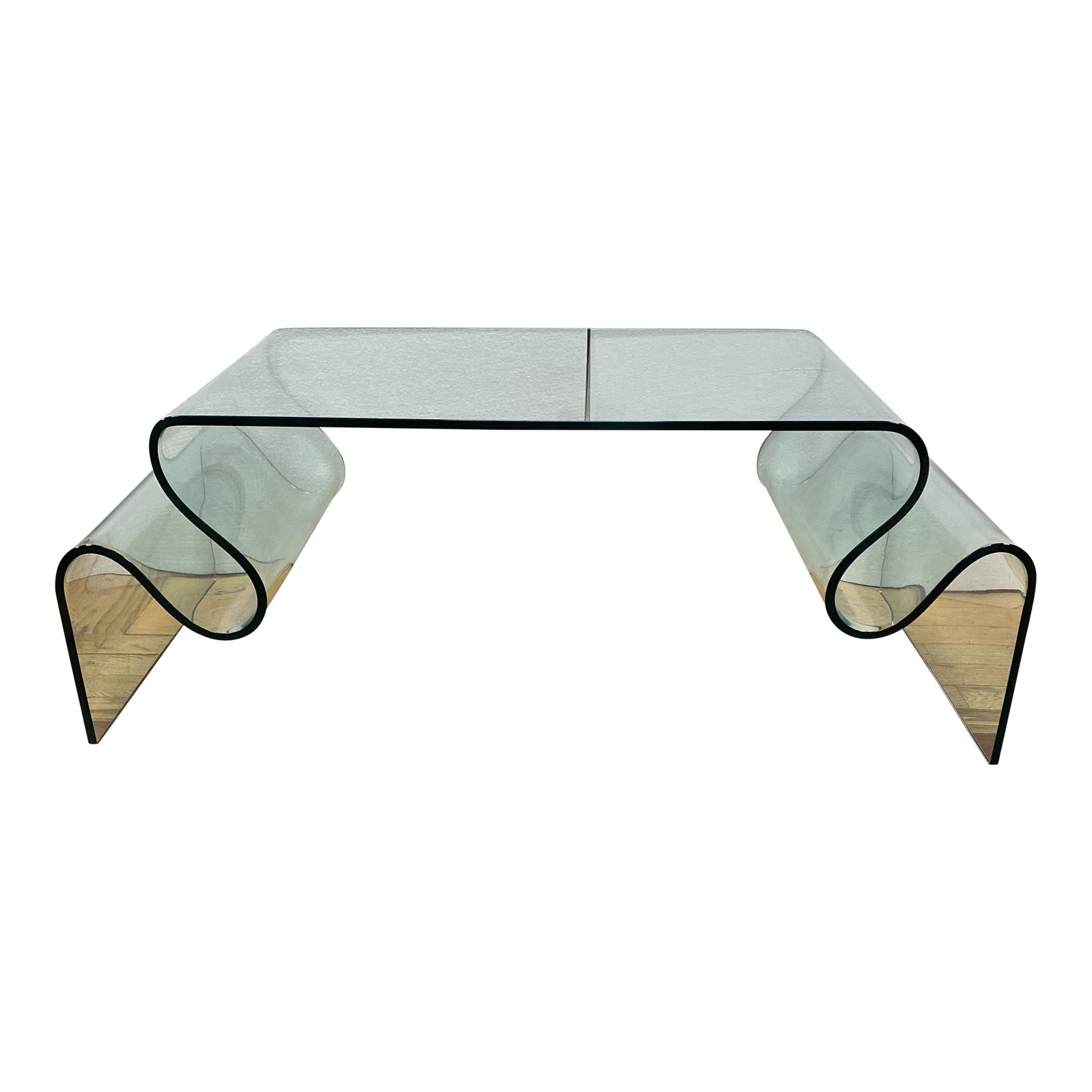 Design Plus Gallery presents a Curved Waterfall Coffee Table. Thick glass is curved in a continuous waterfall fashion fabrication. Minor wear on surfaces. Easy to clean and visually light look would be ideal for airy spaces and showcasing a beautiful rug.