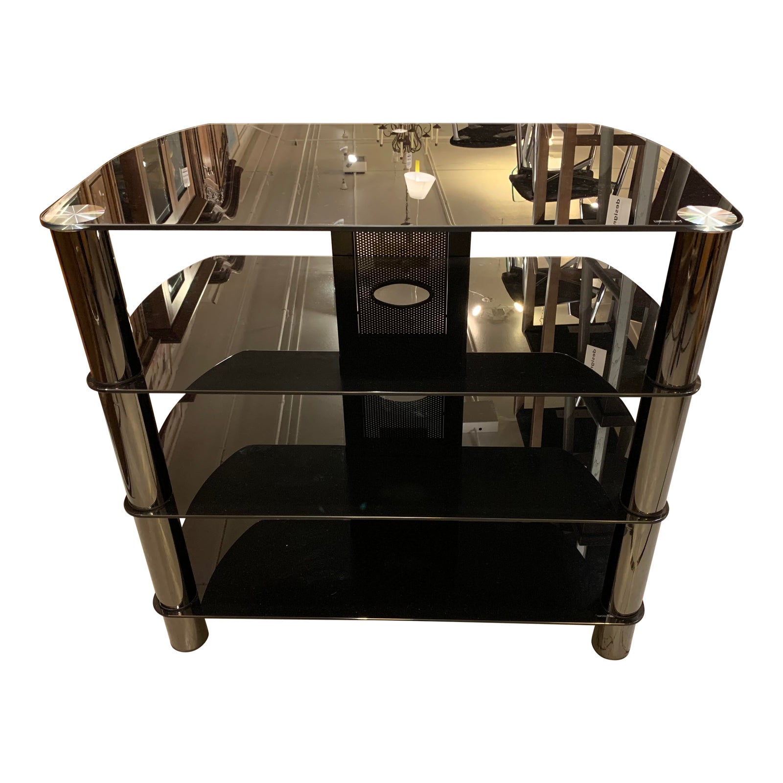 Design Plus Gallery presents a Modern Style Three Tiered Metal + Glass Media Stand. Black Tempered glass combined with perforated black metal and electrical outputs make this unit ideal for media components that need accessibility. Minor wear on surfaces. Front legs are polished tubular steel.
