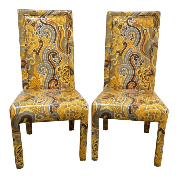 Design Plus Gallery presents a pair of Custom Pair of Mod Side Chairs. The simple parsons silhouette allows the dynamic pattern and striking color of the vinyl upholstery to be center stage. Complementary hues of golds, grays and browns swirls and florals create the fun. Great fun.