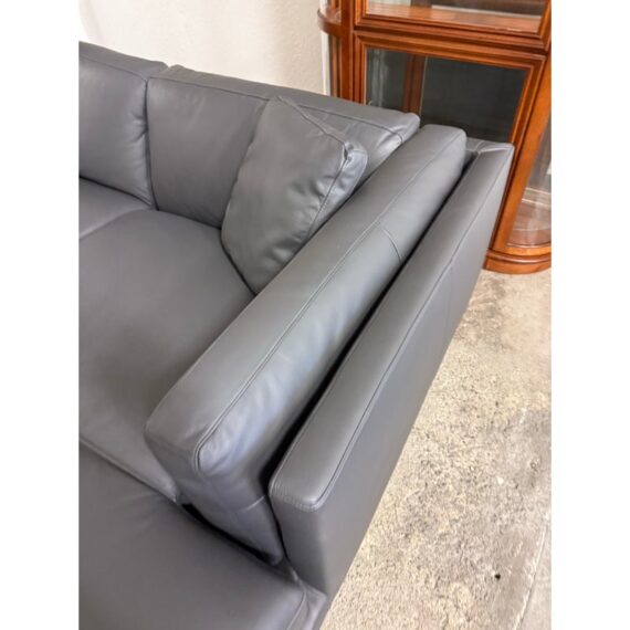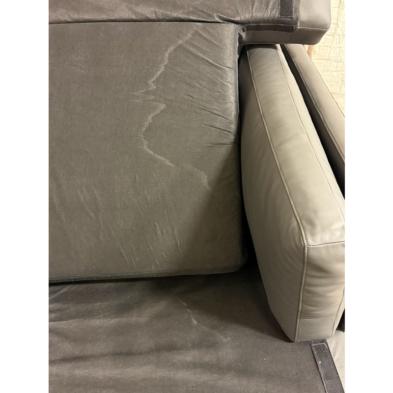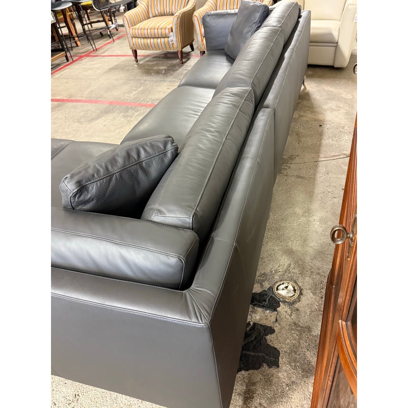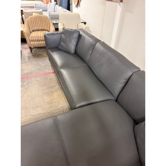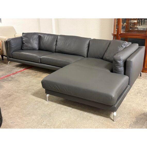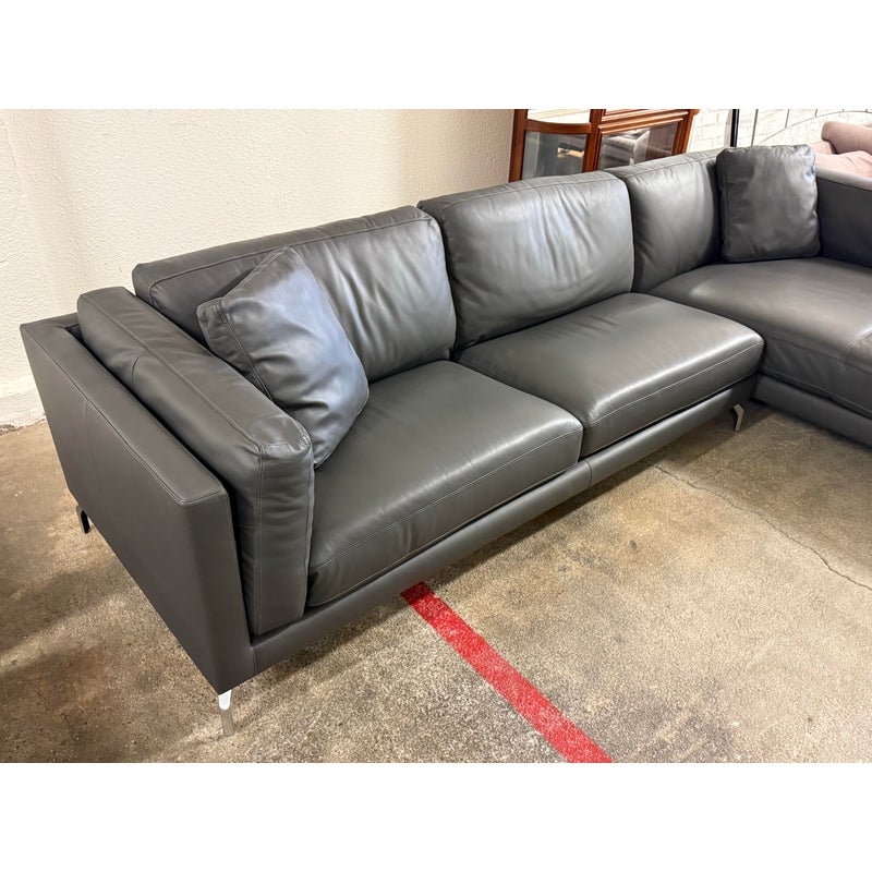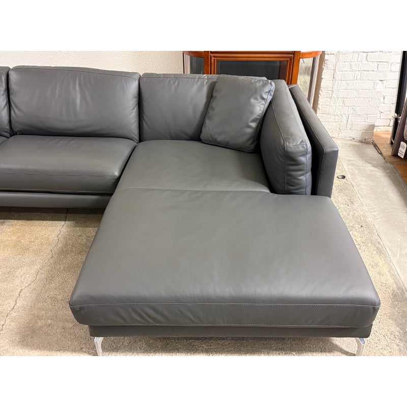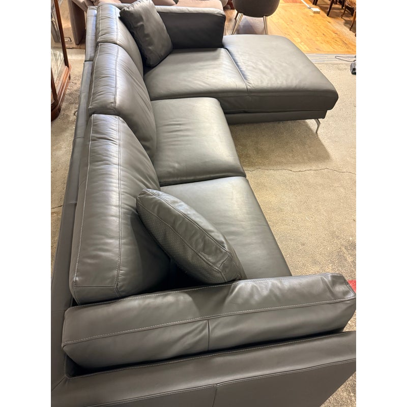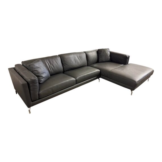 Design Plus Gallery presents the Reade Right Chaise Sectional from Modloft. Enjoy the spacious and retro mid-century modern design that is punctuated by its geometric, polished, angled legs, and combination of plush cushions and deep seats. The Reade sectional is known for its quality craftsmanship as it is sturdily constructed of kiln-dried solid wood frame, semi-aniline top-grade Brazilian leather, and elegantly detailed with hand-sewn French seams. It includes two over-sized leather throw pillows. At home in a formal or relaxed living space, the Reade sectional sofa offers the ultimate in comfort and design. Is in good condition for its usage. Visible wear and stains underneath the cushions. Made in Brazil.