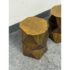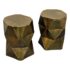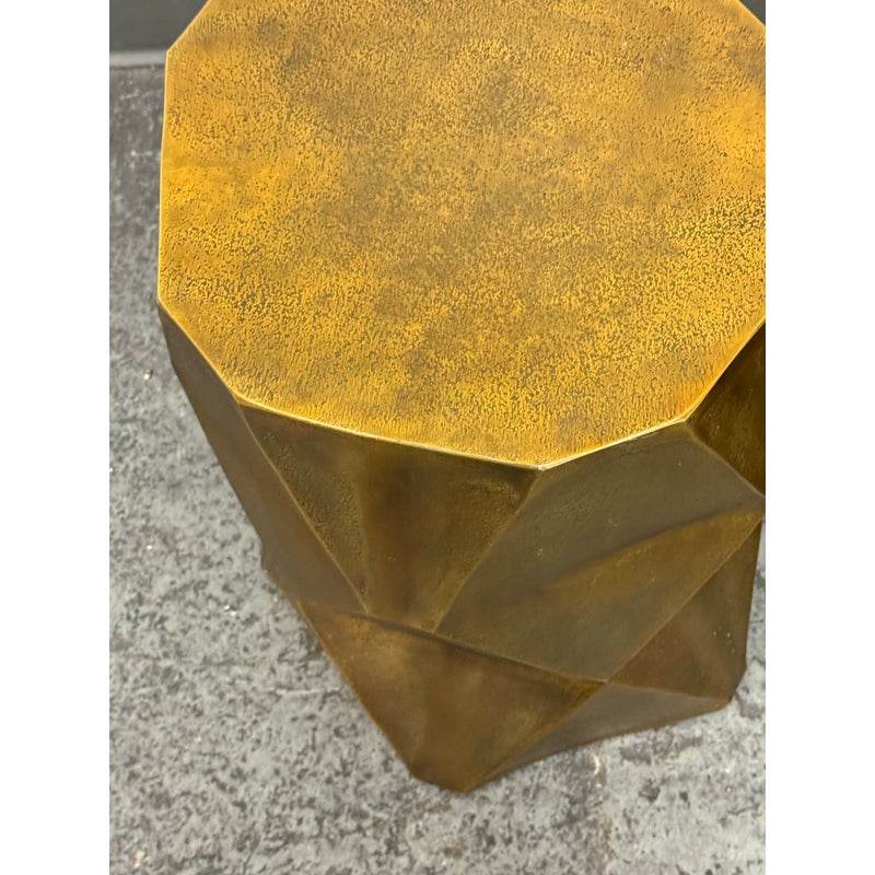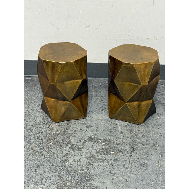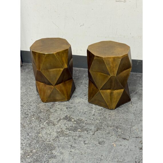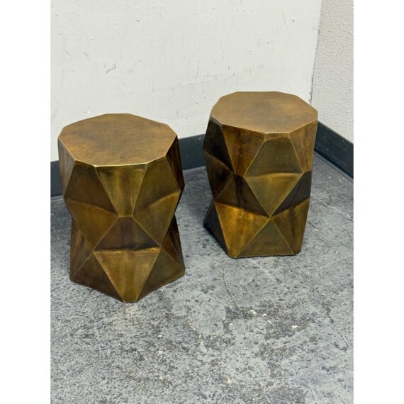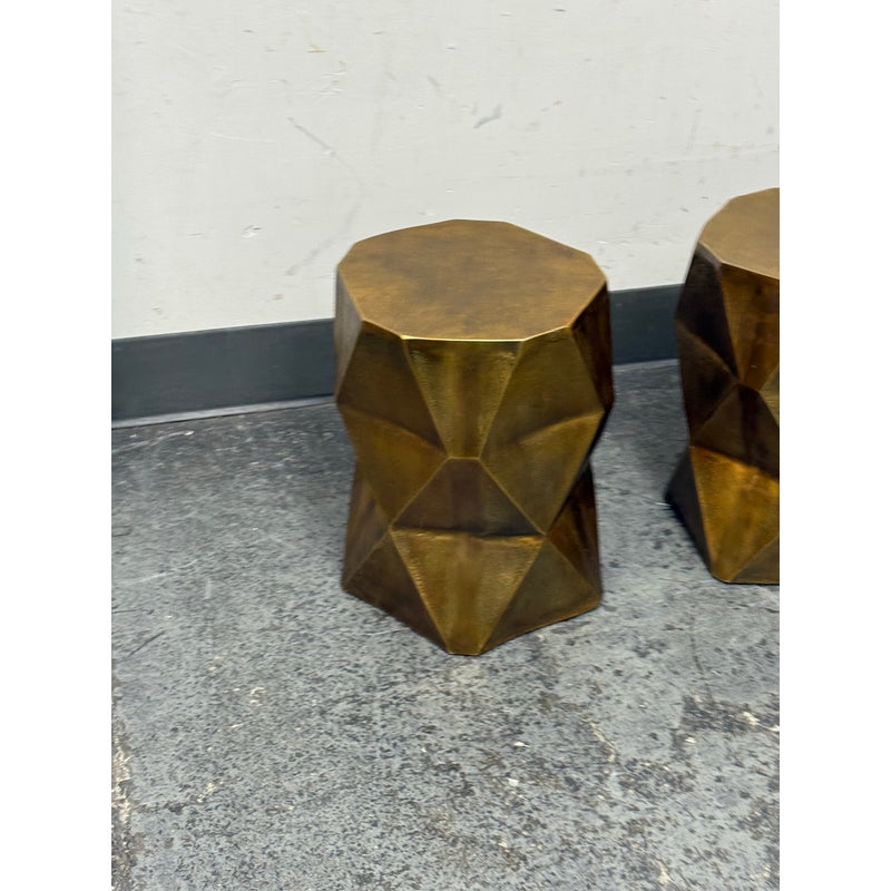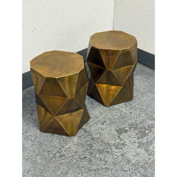 Design Plus Gallery presents a Pair of Quintus Accent Tables from Moe’s Homes. The pair of tables have a bold geometric design with faceted profile and an octagonal top. The antique brass surface shows a mottled, aged tone that highlights the angular planes and gives the piece strong visual dimension. Made of lightweight aluminum, it offers the look of metal with easier mobility and a solid, stable stance. These were showroom sample and are in good condition with visible and minimal wear from usage.