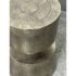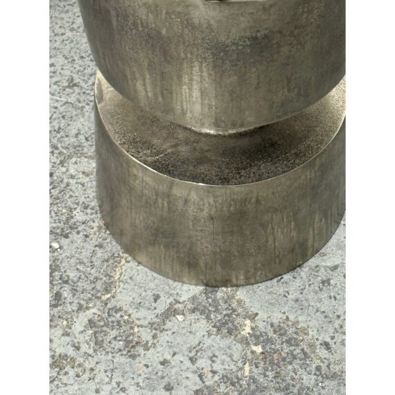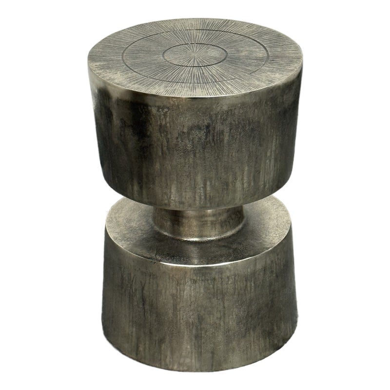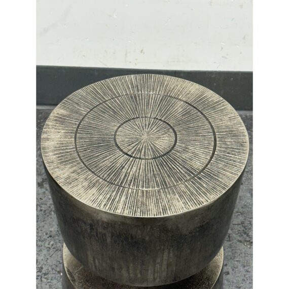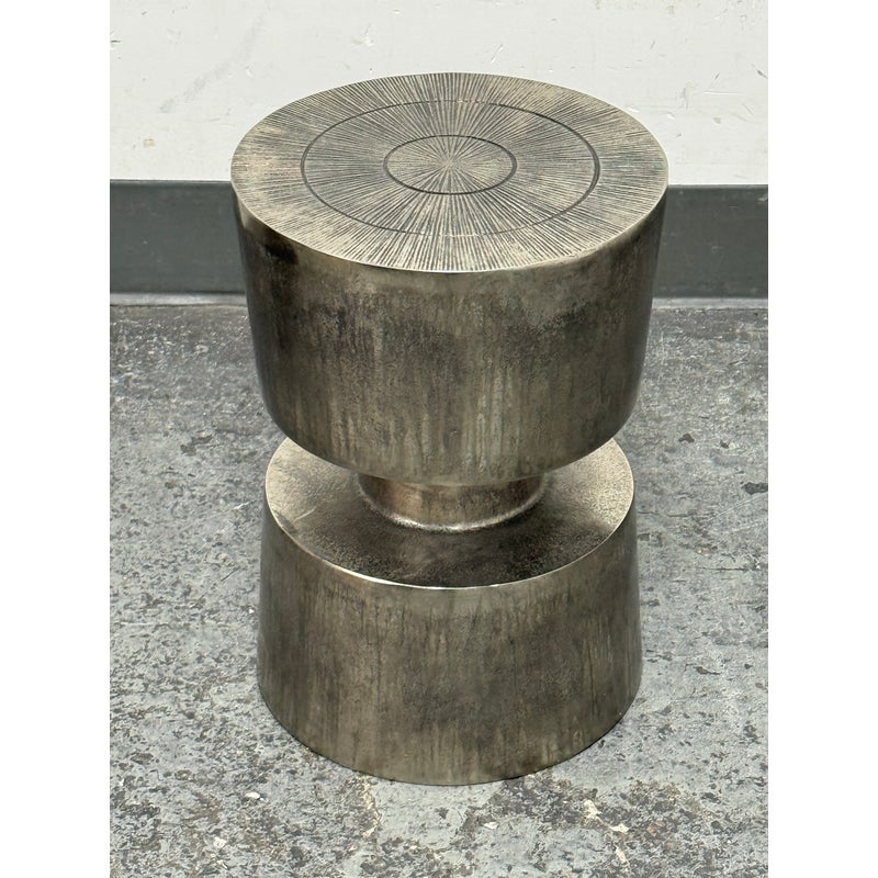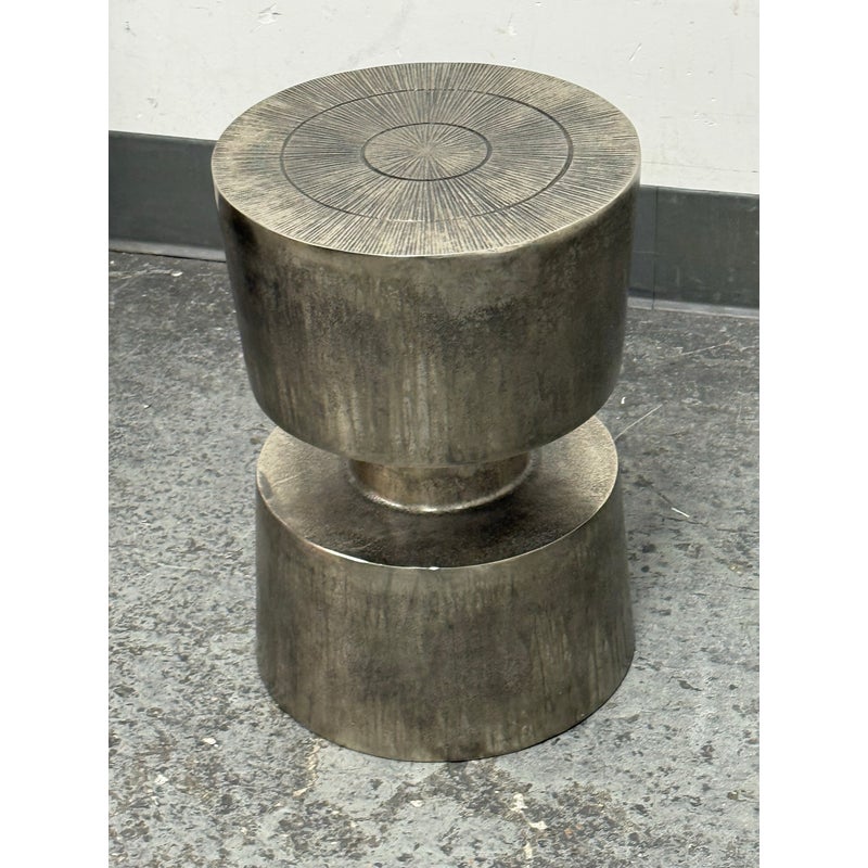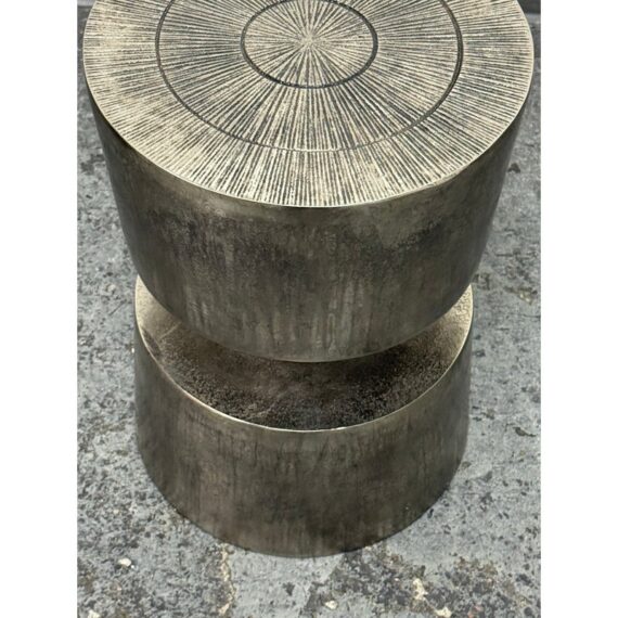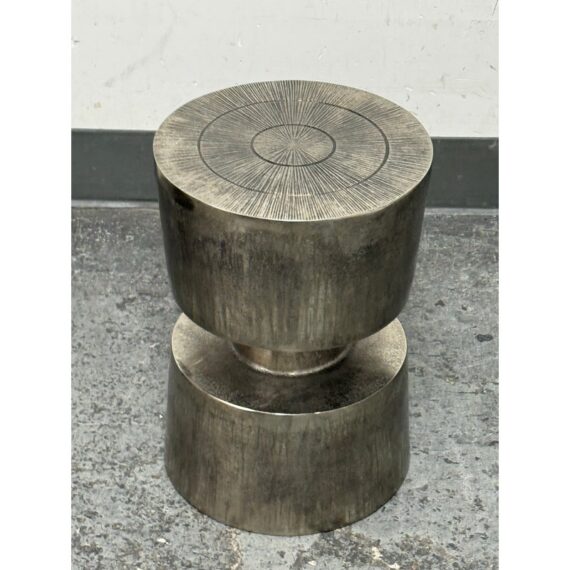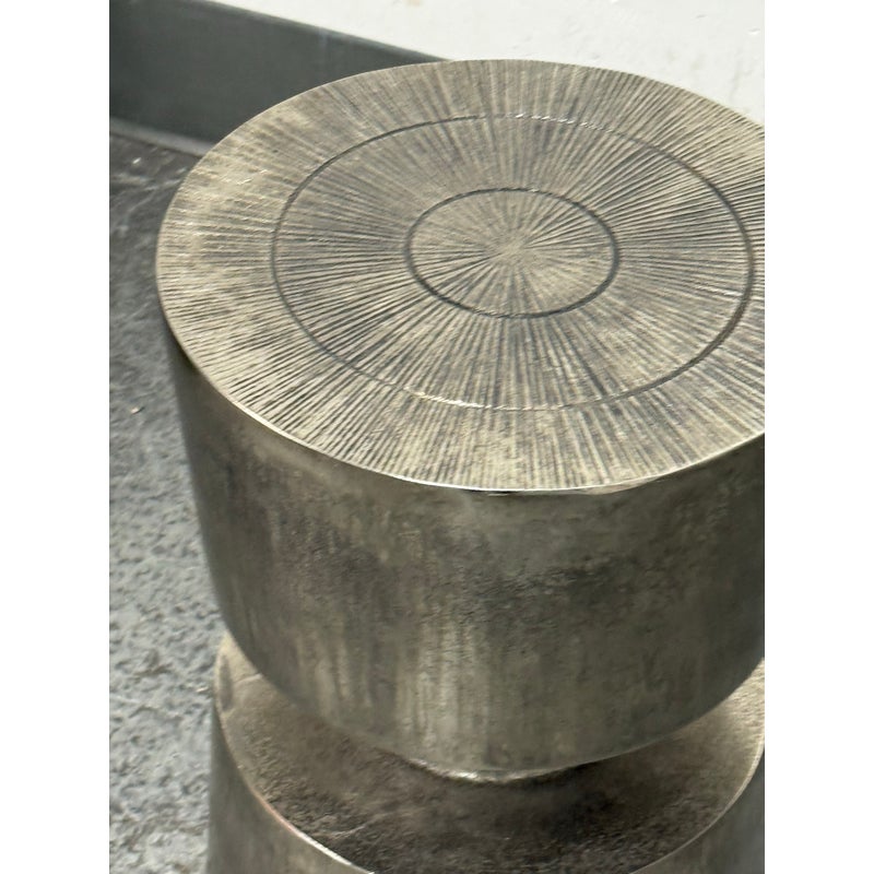 Design Plus Gallery presents a Victor Side Table/Stool from Moe’s Home. This sculptural accent table/stool is cast in aluminum and styled as stacked cylinders with a narrow waist for a bold silhouette. The top surface is detailed with concentric rings and radiating line work, adding texture and visual depth. The nickel-toned surface has an antiqued patina with natural variation that gives each piece its own character. It is in good condition with visible and minimal wear from usage.