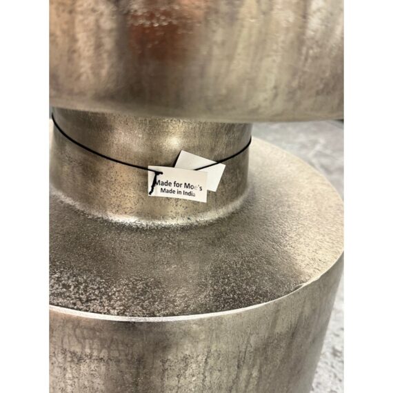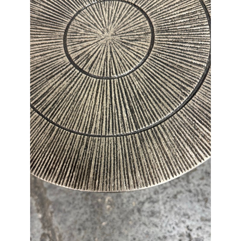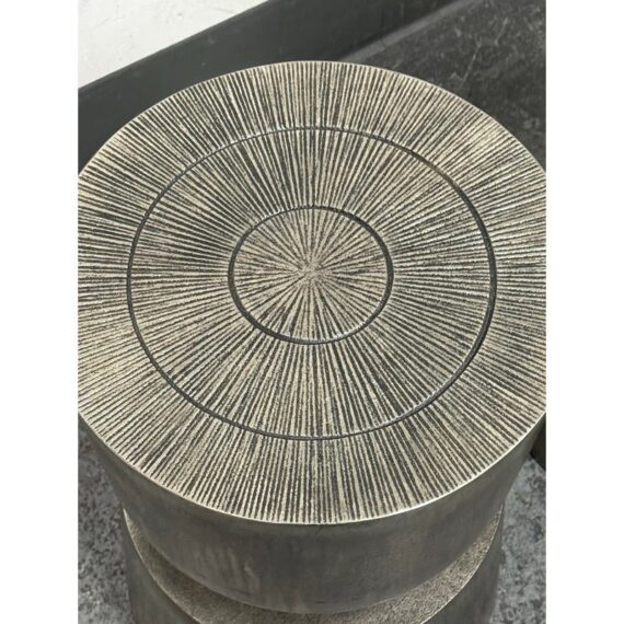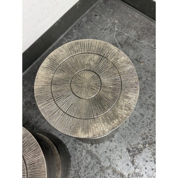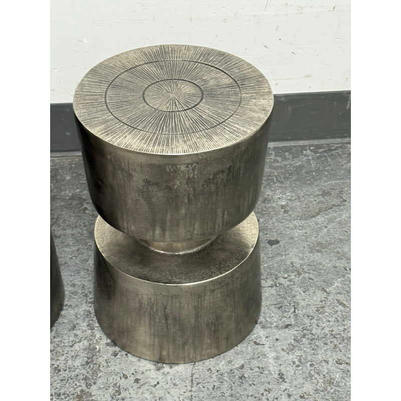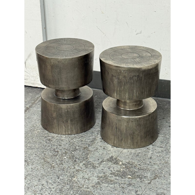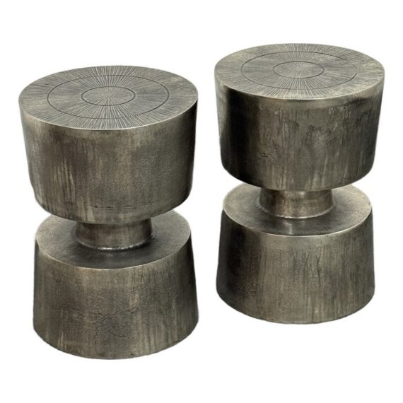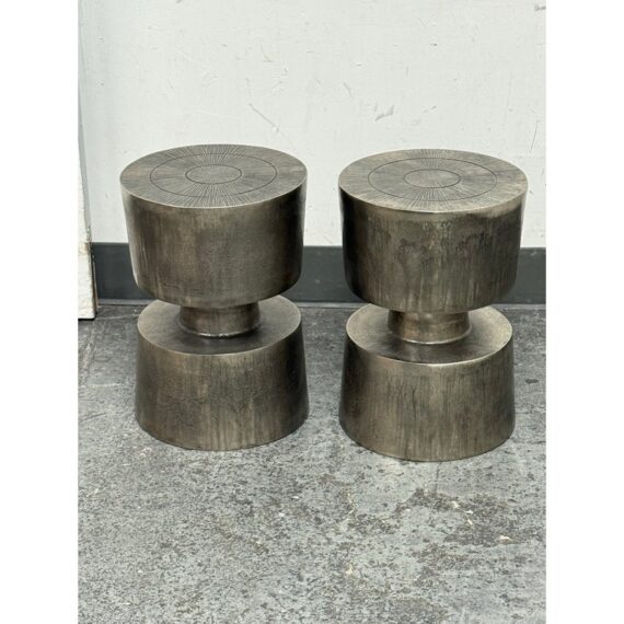 Design Plus Gallery presents a Pair of Victor Side Tables/Stools from Moe’s Home. The sculptural accent tables/stools are cast in aluminum and styled as stacked cylinders with a narrow waist for a bold silhouette. The top surface is detailed with concentric rings and radiating line work that add texture and visual depth. The nickel-toned surface has an antiqued patina with natural variation that gives each piece its own character. These items are in good condition with visible and minimal wear from usage.