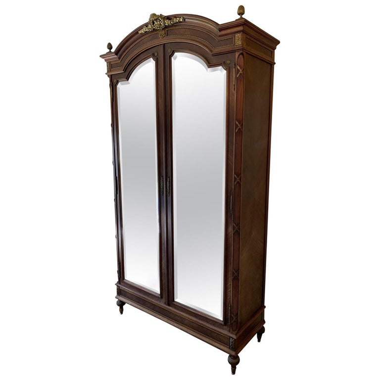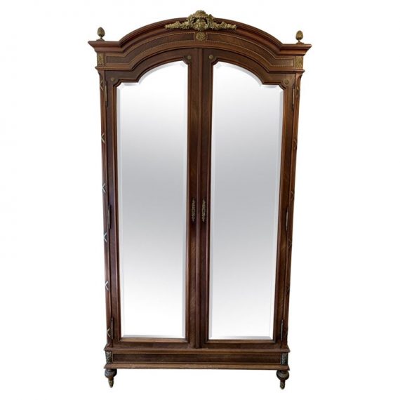 Design Plus Gallery presents a stunning Antique French Armoire. The French armoire is 19th Century mahogany-Louis XVI style with antiqued beveled mirror doors. The inside has beautiful shelves and several drawers that are finished with the same intricate brass hardware as the exterior. Unfortunately we have not seen the inside of this beauty, as the movers lost the key.