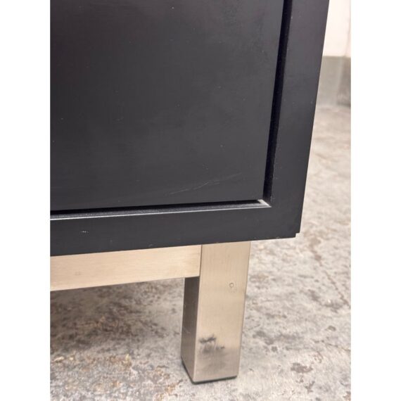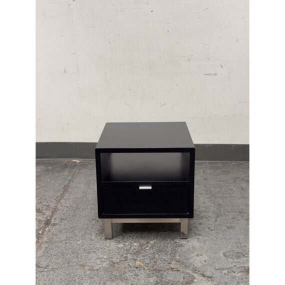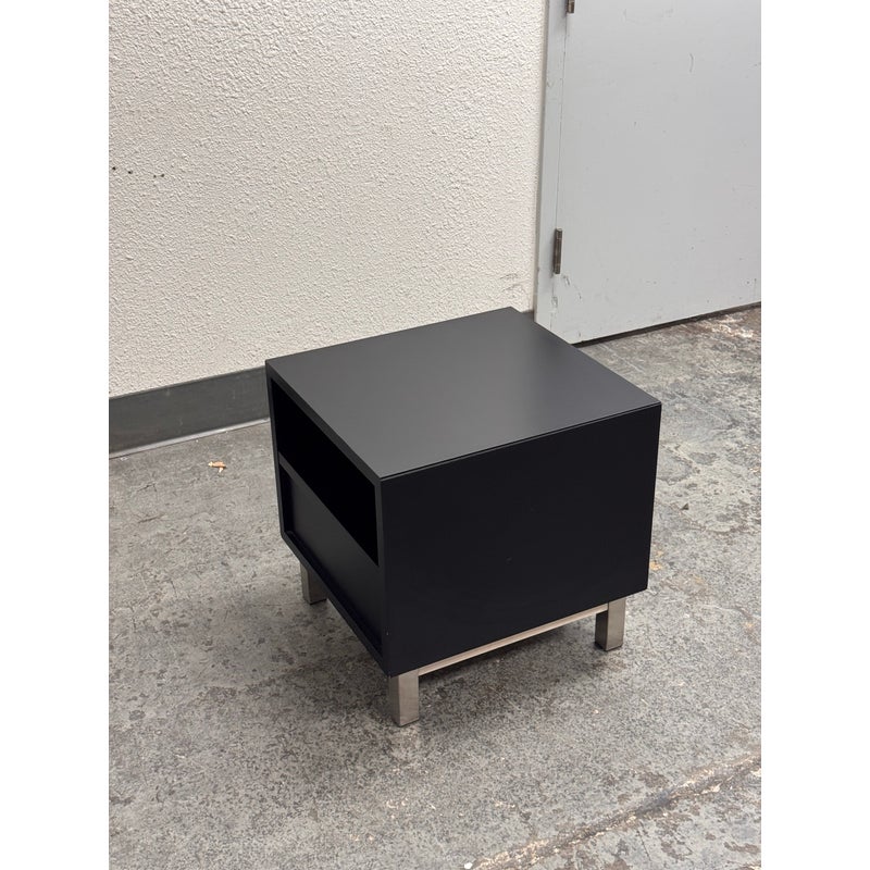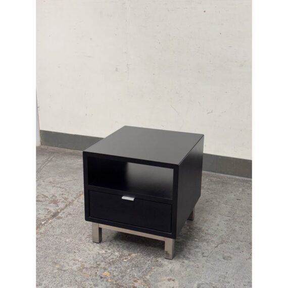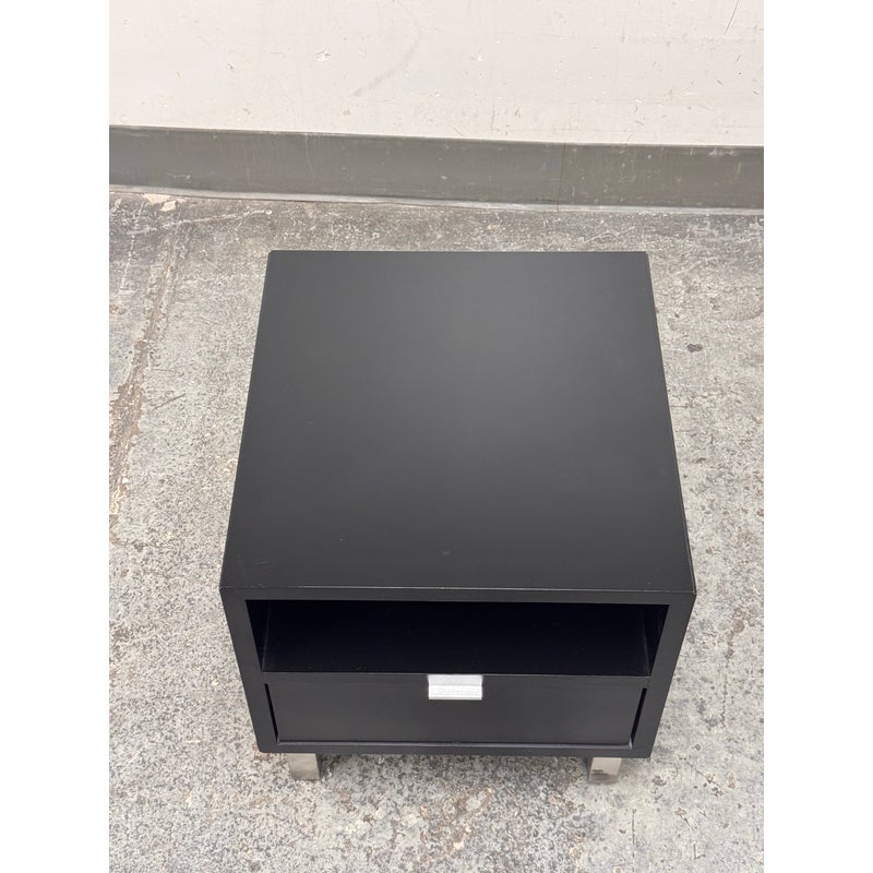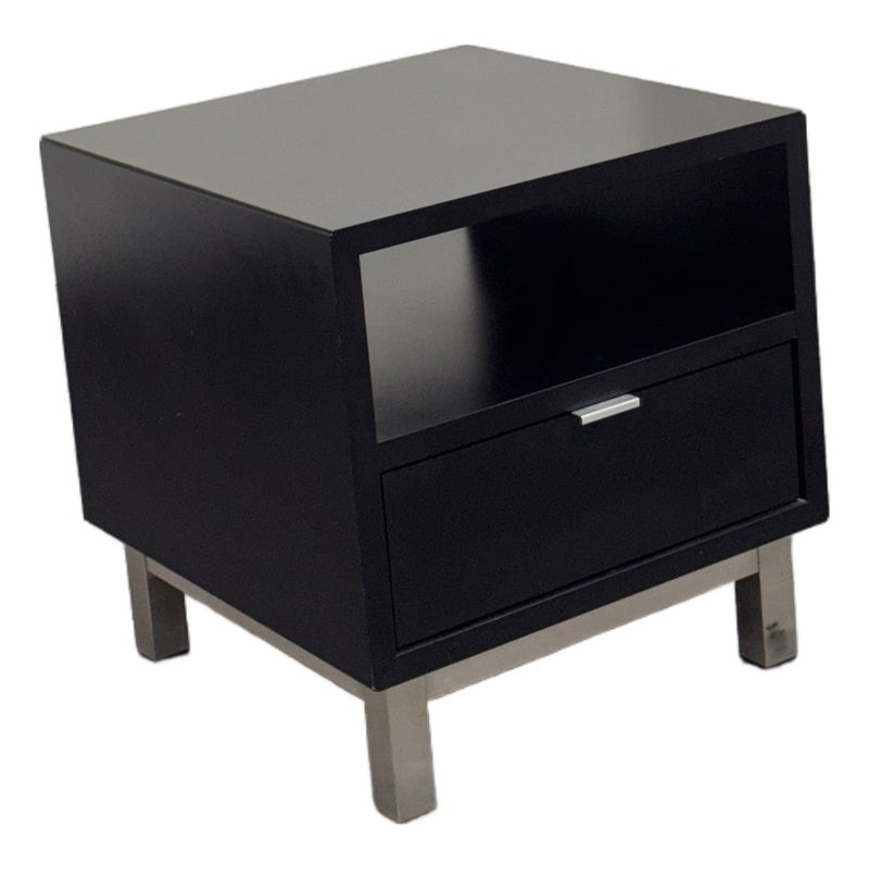 Design Plus Gallery presents the Corte Komodin Nightstand from Morini Home. This compact nightstand has a rectilinear case with an open upper compartment, a lower drawer with a metal pull, and square metal legs that give the piece a streamlined profile. The black exterior contrasts with the brushed metal base, while the drawer and open shelf provide a balanced mix of concealed and accessible storage. Its restrained geometry and mixed material construction reflect a contemporary minimalist approach. It is in good condition with visible and minimal wear from usage.
