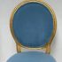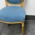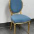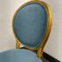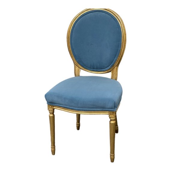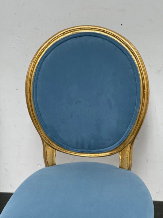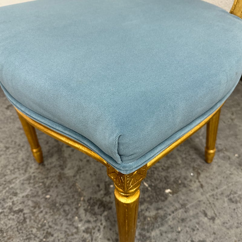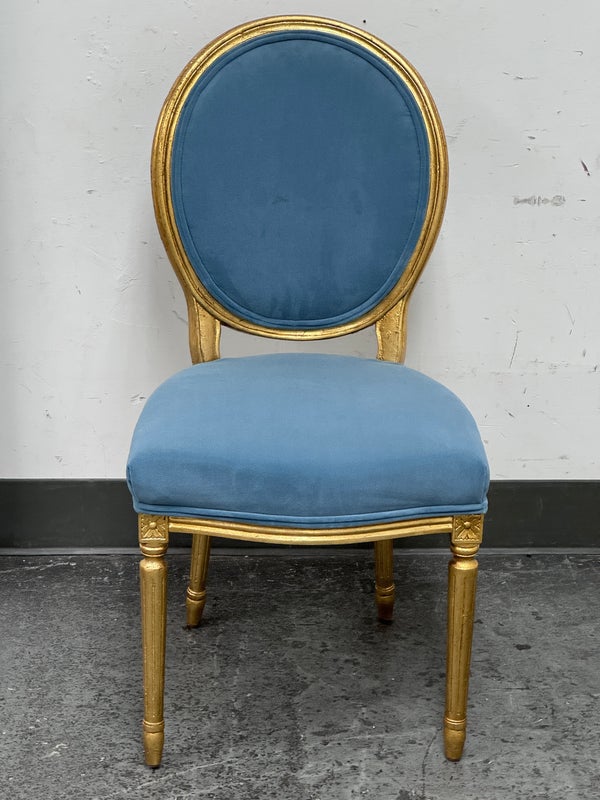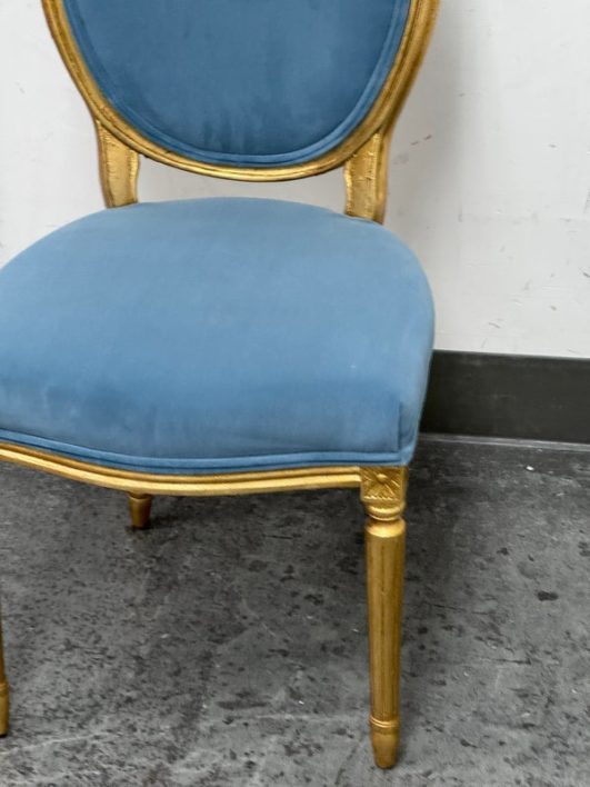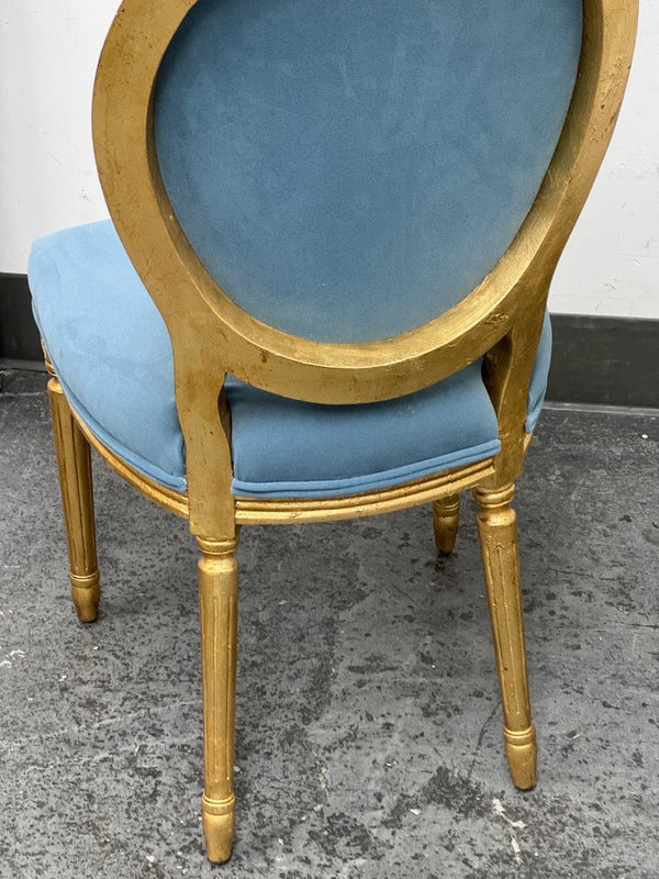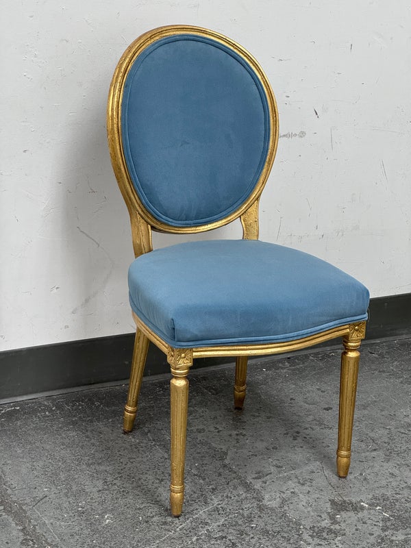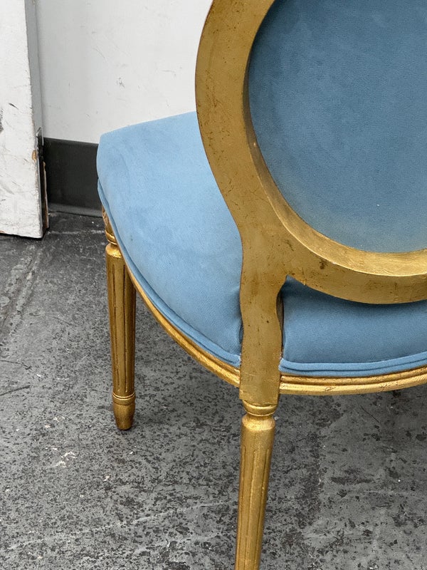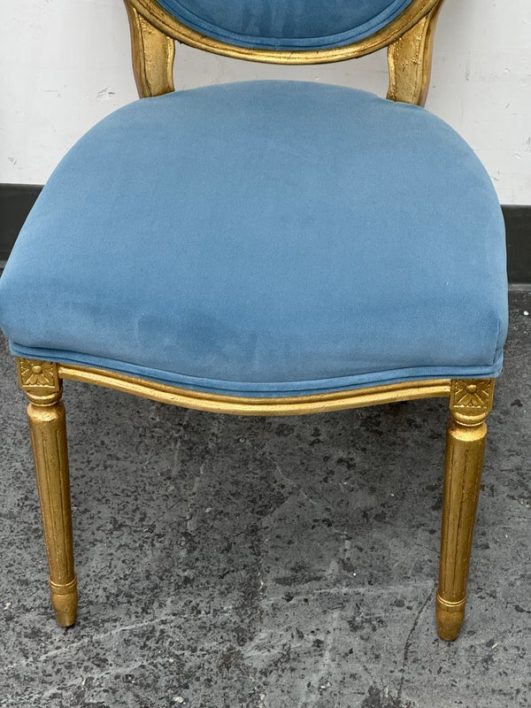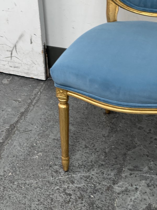 Design Plus Gallery presents a Louis XVI Style Side Chais by Moss Studio. Custom made with a gilt gold frame that have tapered legs and elegant carved moldings. Robin’s Egg Blue Velvet is the upholstery color with seat back and front showing off the stunning color. In good condition, minimal wear from usage + age.