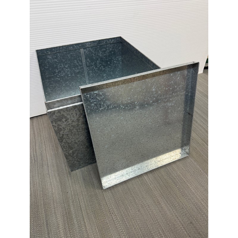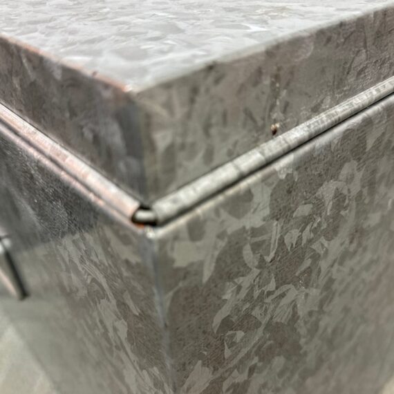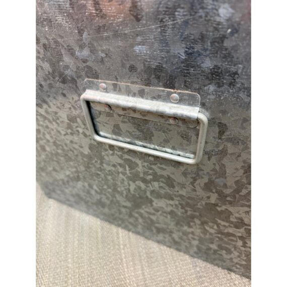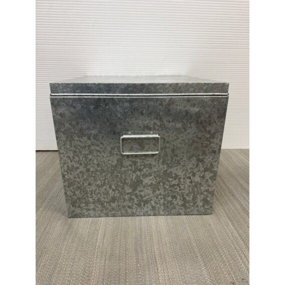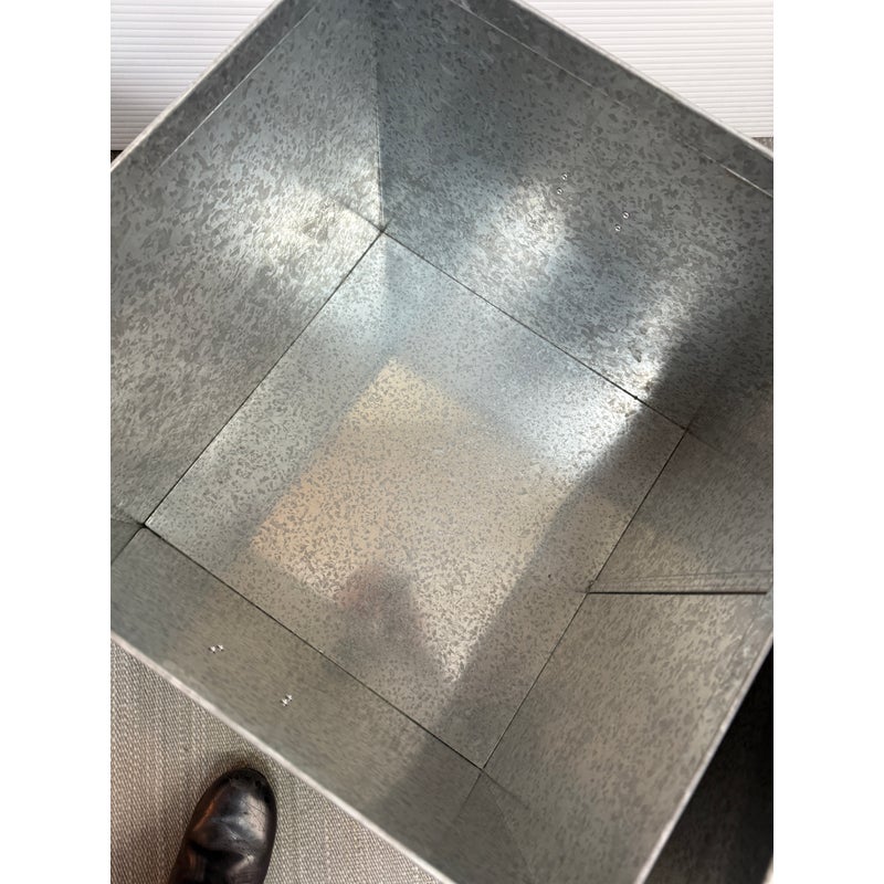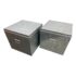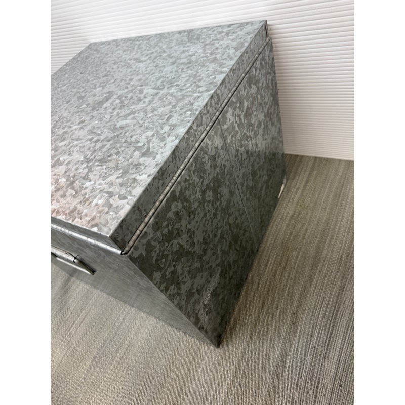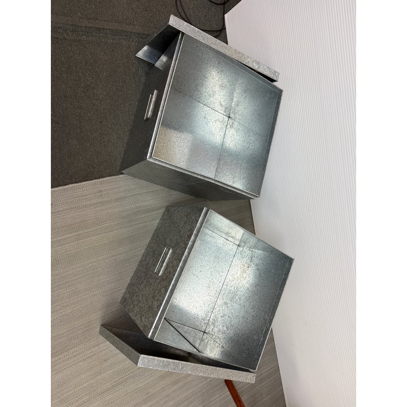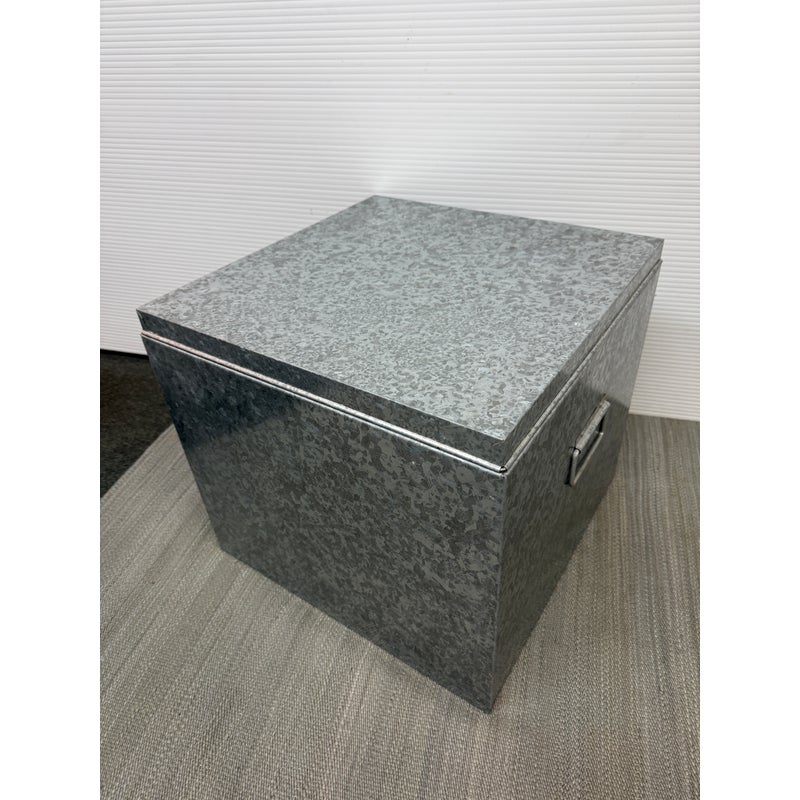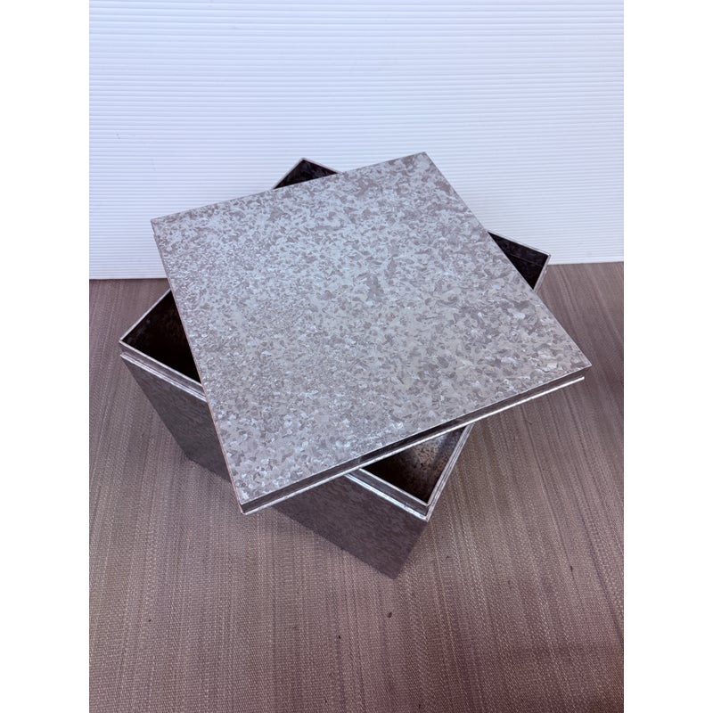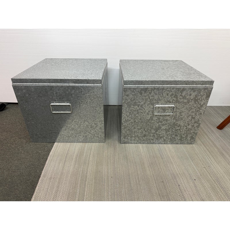 Design Plus Gallery presents a Pair of Galvanized Tin Cubes from Muji. Simple, industrial and rust-resistant galvanized tin creates these sturdy and attractive cubes. The lipped lid opens to reveal a large amount of storage, and also keeps the pair aligned when stacked. Scale allows the cubes to function as side tables that are light enough to move where needed. Light wear; condition is good. Made in Japan