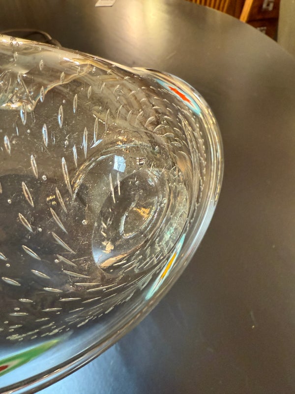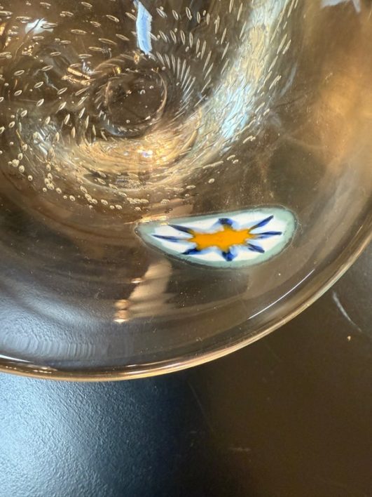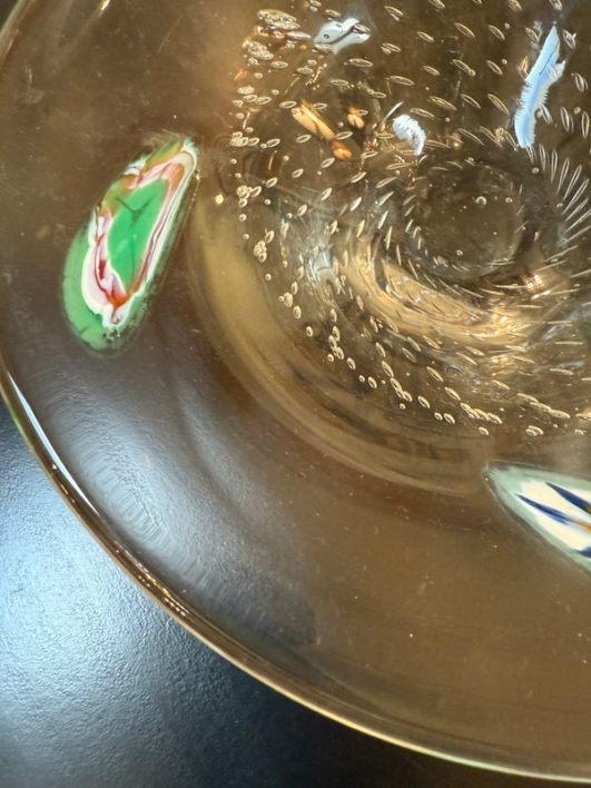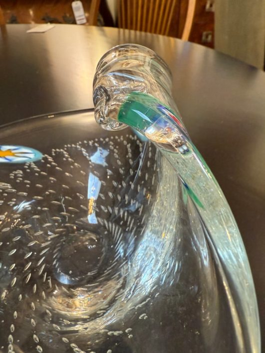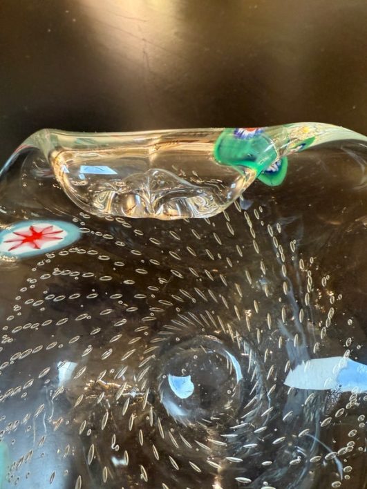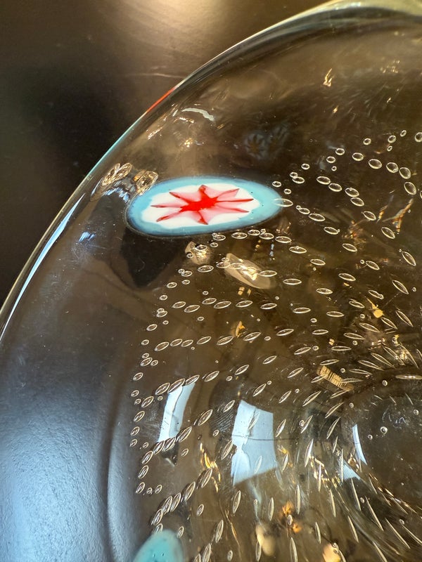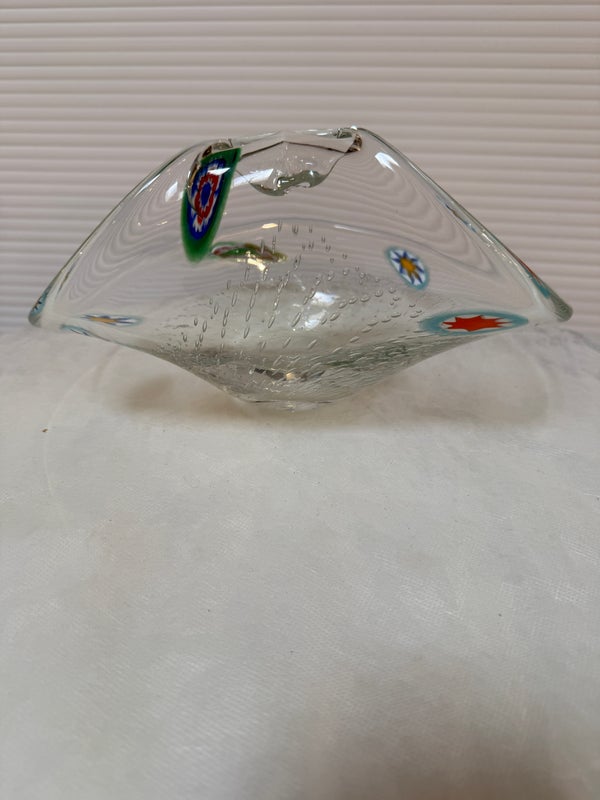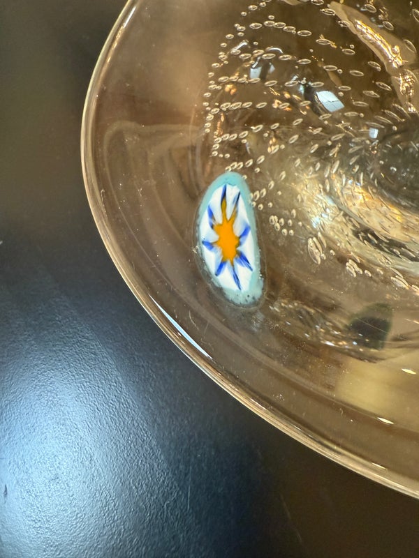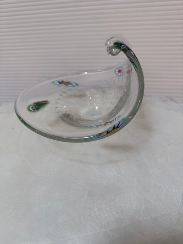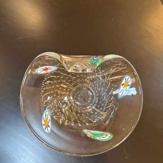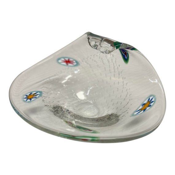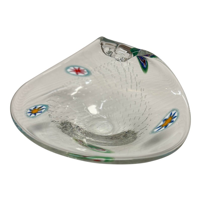 Design Plus Gallery presents a Vintage Millefiori Dish by Murano. The organic shape in clear glass is etched in mesmerizing spiral with each of “a thousand flowers” swirls in orbit. A beautiful jewel for admiring or for use as a vessel. Unsigned. Condition is good.