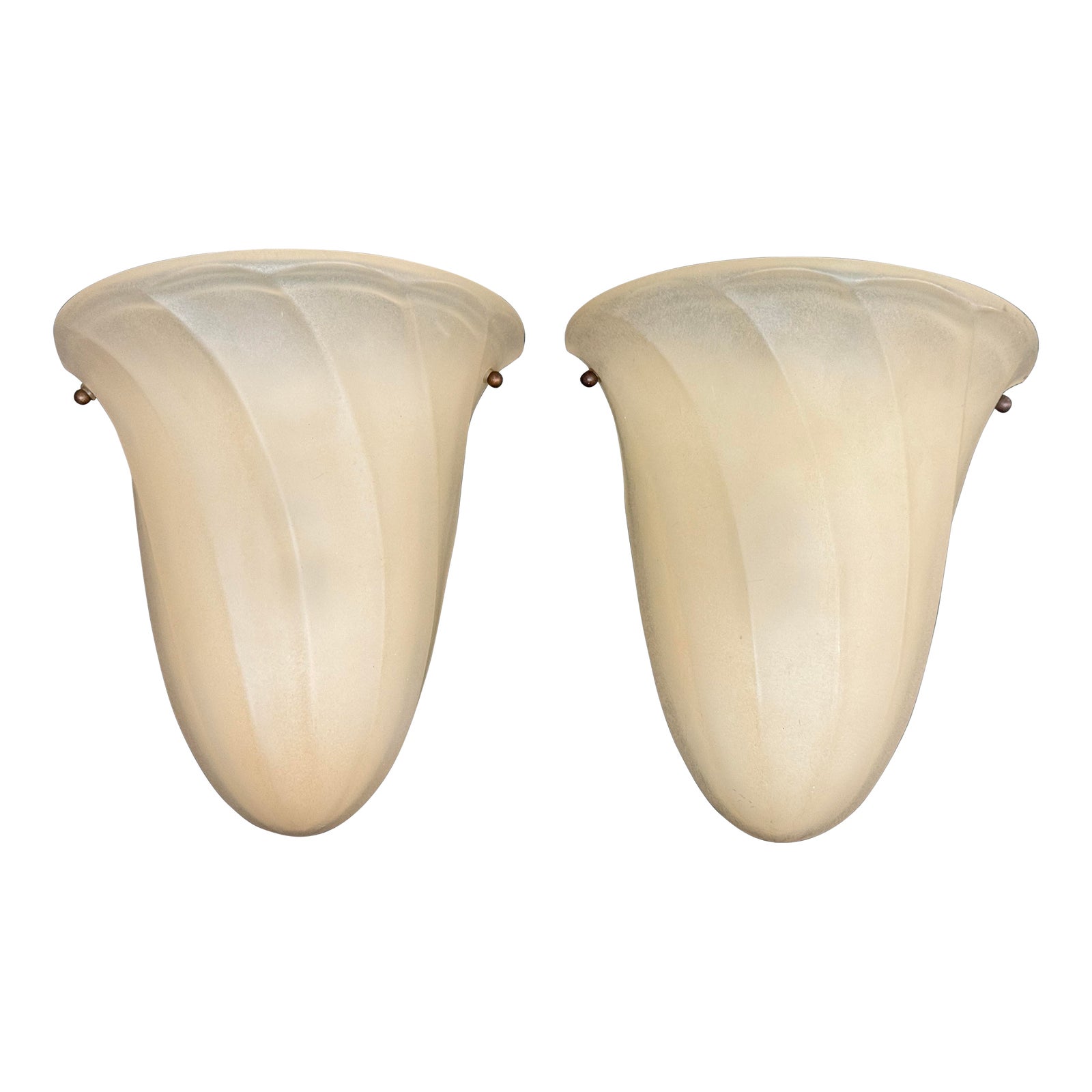 Design Plus Gallery presents a Pair of Frosted Glass Sconces by Miranda Feiss. The swirled frosted glass shape, tapering to a soft point, adds a warm glow to any space. Metal backplate holds one bulb, suitable for dry locations. Little evidence of surface wear; condition is consistent age and use.