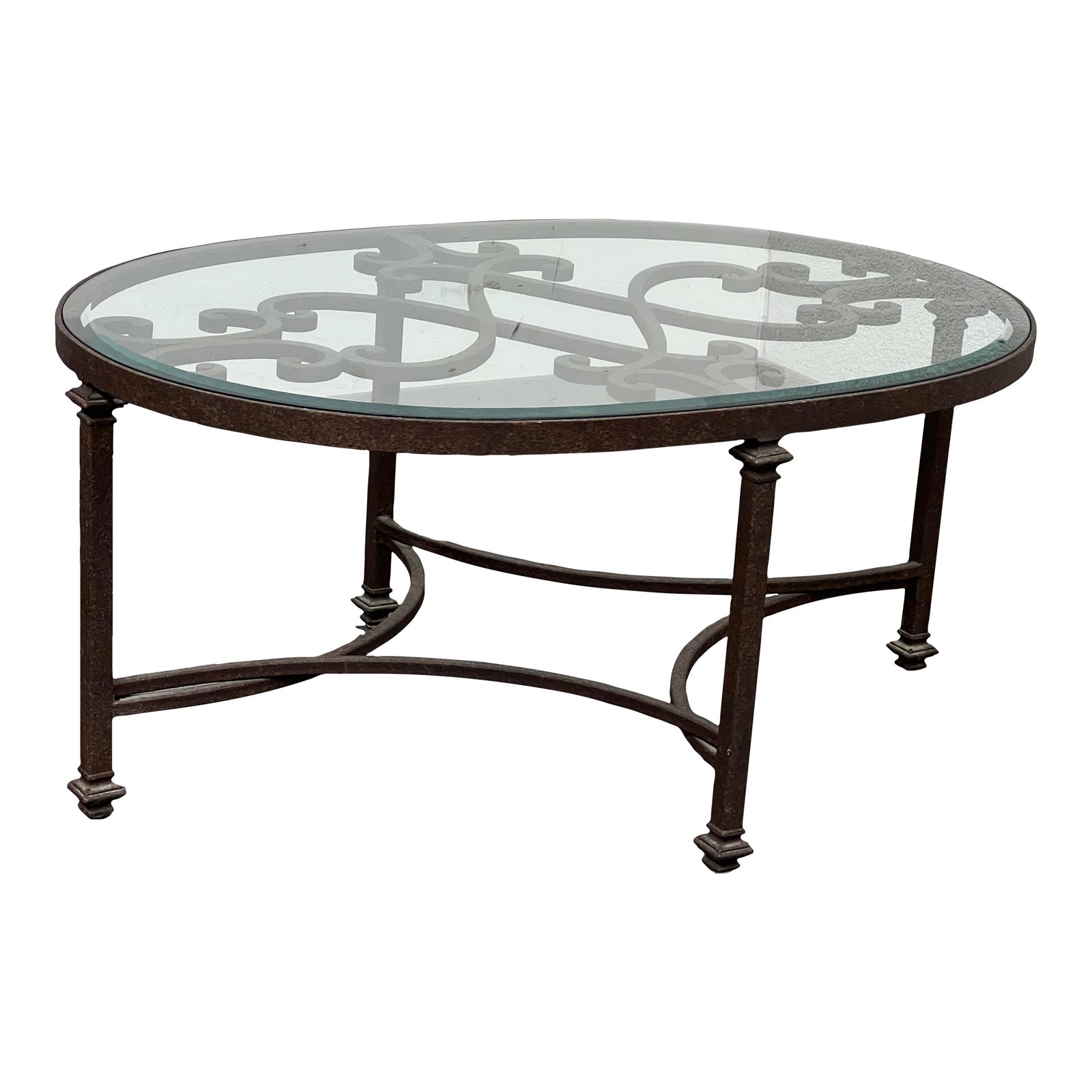 Design Plus Gallery presents an Romantique Coffee Table by Murrays Iron Works. All iron construction with hand forged square iron button scrolled filigree. Overlapping square iron curved stretcher. Gorgeous lines and flow, will look great inside or outside. Iron has a rich patina, glass in good condition. The finish is Autumn. Minor wear from usage. This is a discounted model. Made in USA.