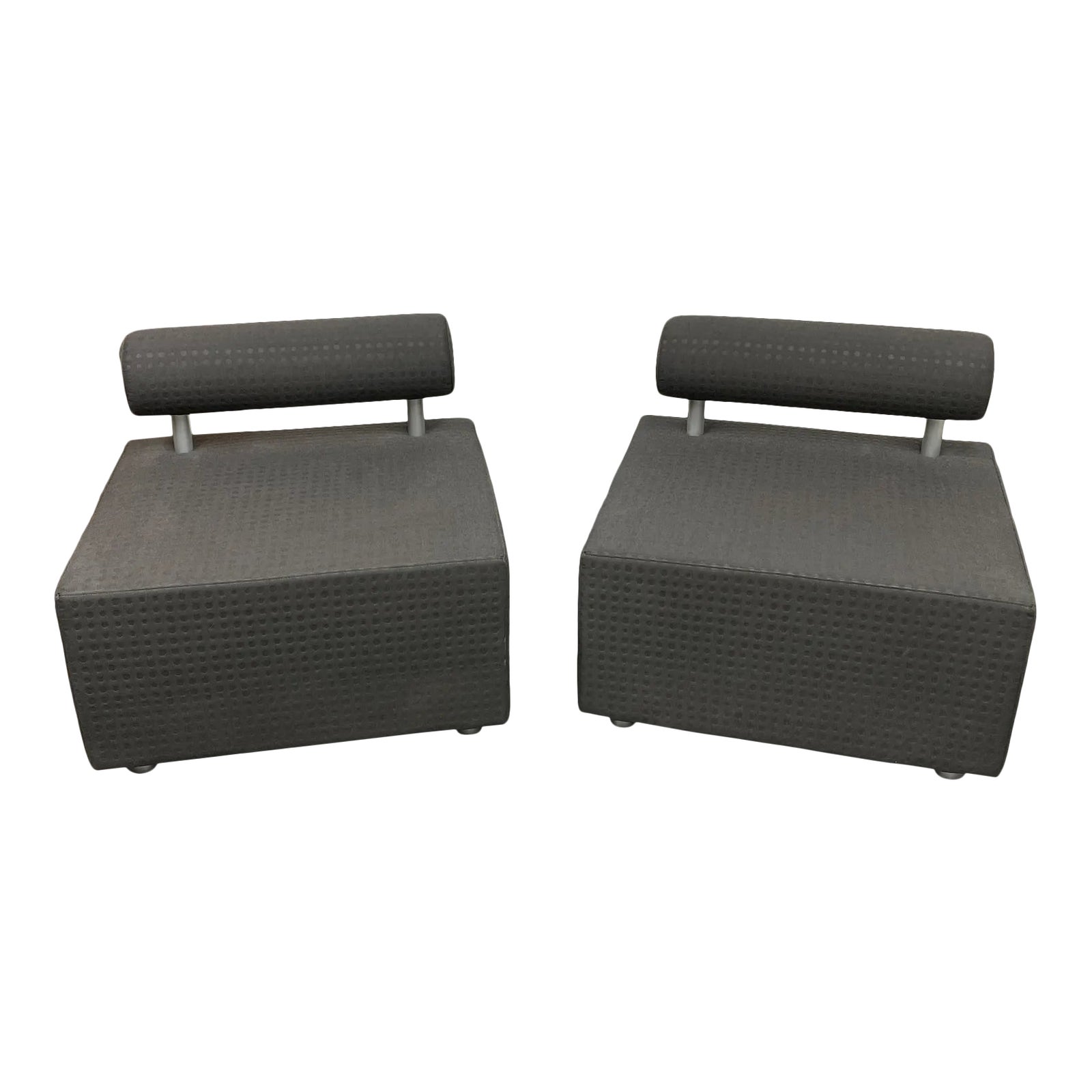 Design Plus Gallery presents a Pair of Myrtle Mueller for Haworth Custom Modular Slipper Chairs. Engineered with a quality and attention to detail the Haworth is revered for. The design is further elevated with a sense of post modern whimsy in the shapes and subtle fabric pattern. Upholstered over a high density foam with contract graded grey fabric. Fabric has a subtle tonal variation of polka dot patterning. Back rests complement the fabric pattern with it’s cylindrical form connected by chrome bars. Minor wear through out, pair is in good condition. Made in North Carolina.