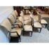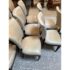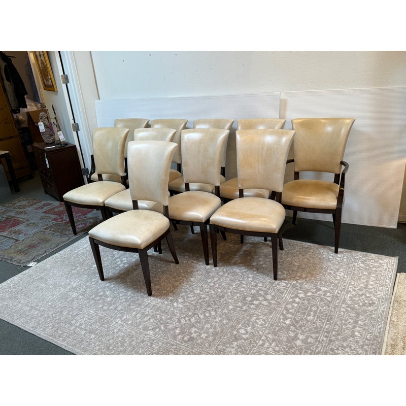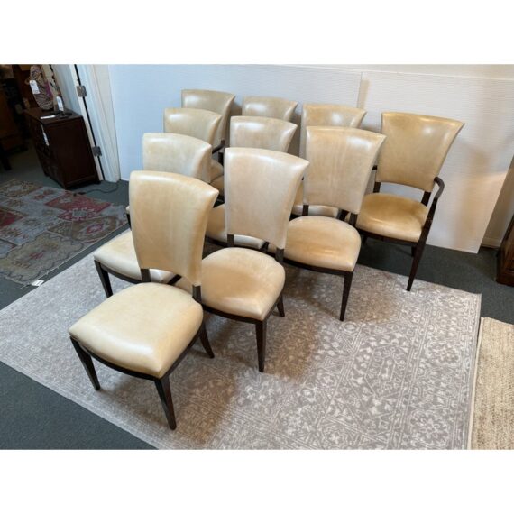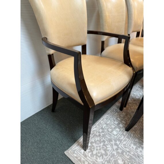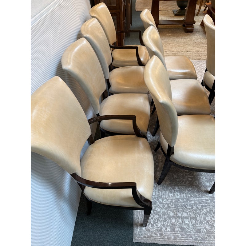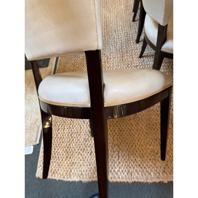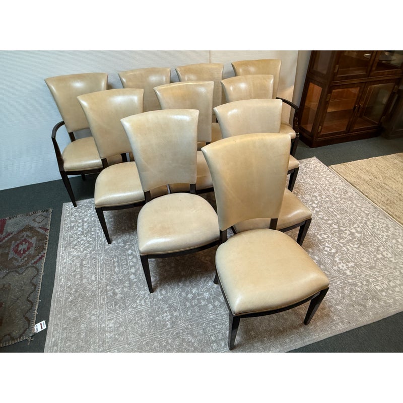 Design Plus Gallery presents a Set of Ten Illusion Leather Dining Chairs from Nancy Corzine. The chairs a creamy taupe leather seat and completely covered back seat rest with thick padding for comfort. The wood has a dark stain, lacquered in their African Walnut High Polish. The chairs will give you dining room a comfortable and refined feel, able to host just about anyone with regal. They show minimal signs of visible wear for their usage. Made in the USA.