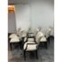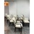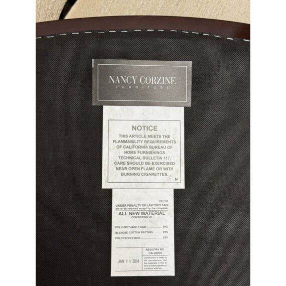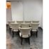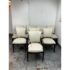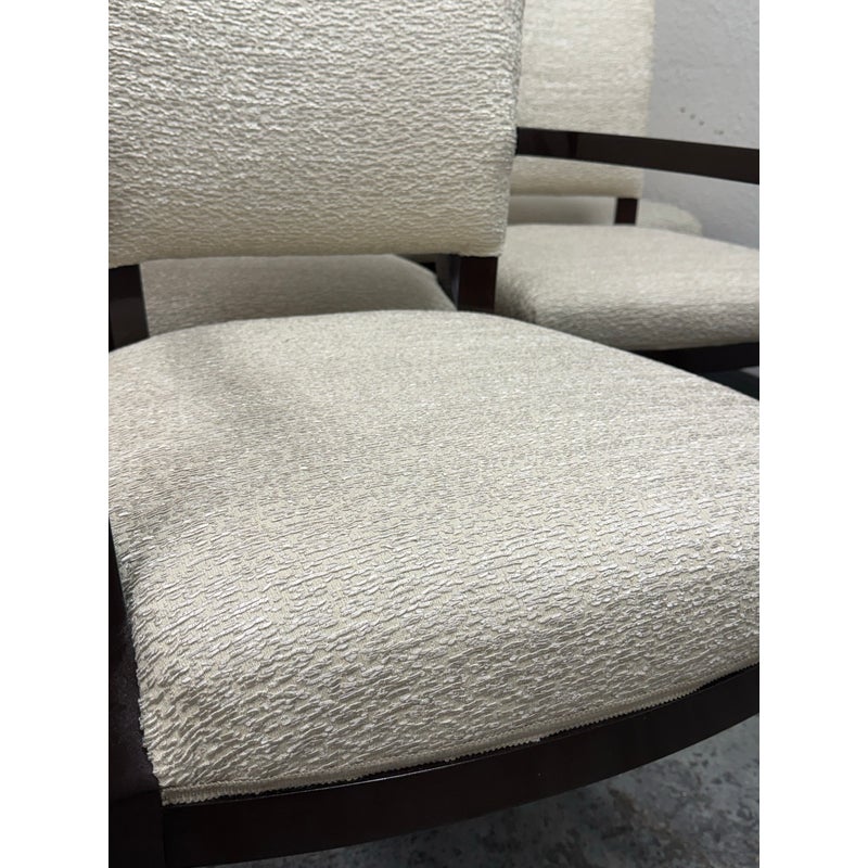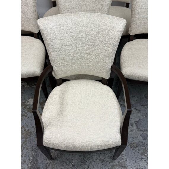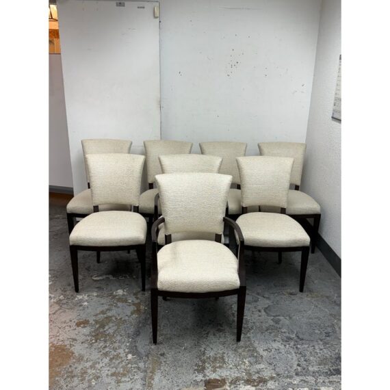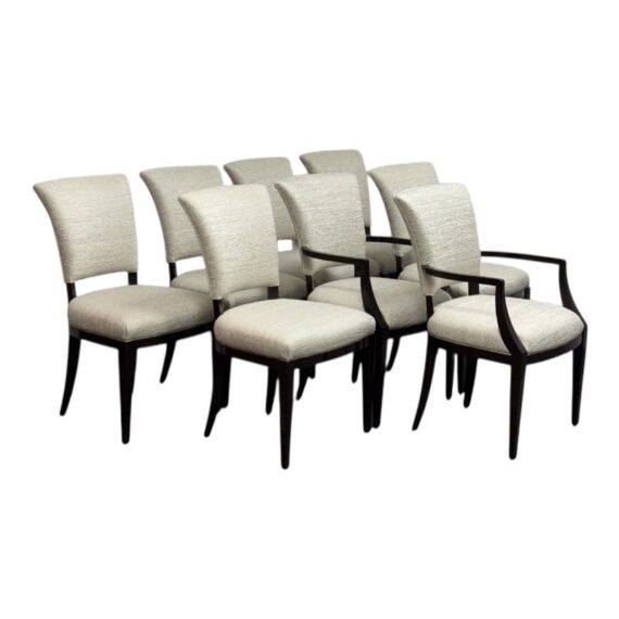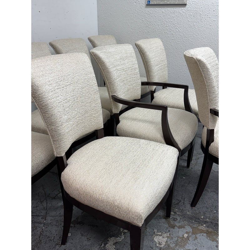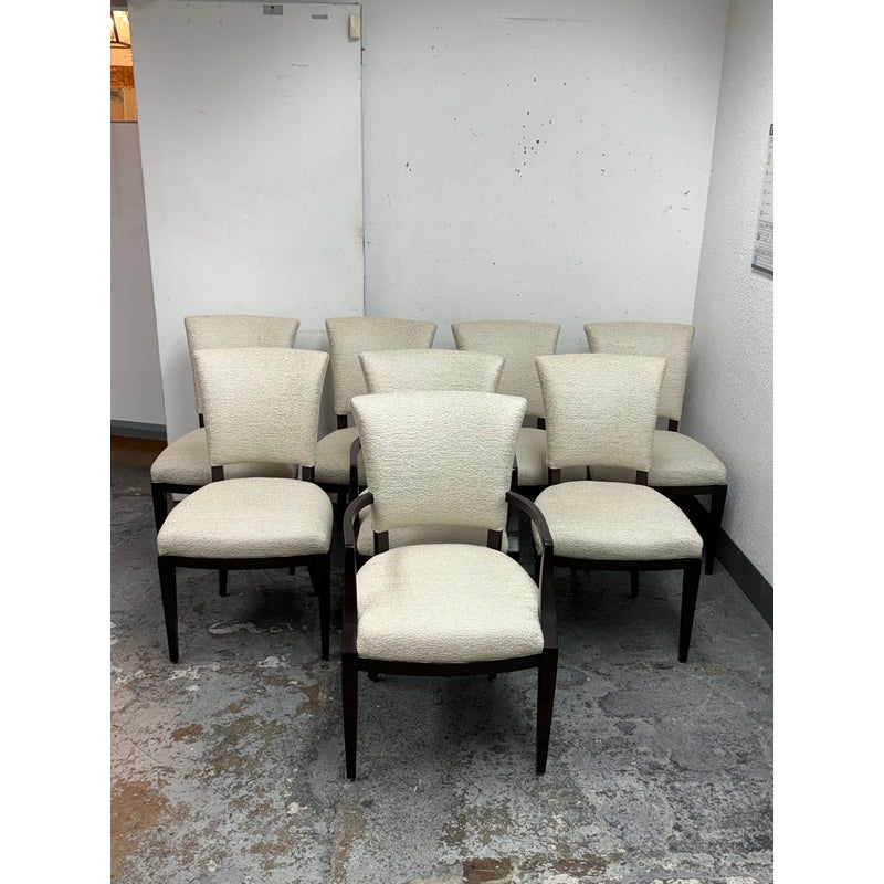 Design Plus Gallery presents a Set of Eight Venus Dining Chairs from Nancy Corzine. This coordinated set includes two armchairs and six side chairs, all upholstered in an off-white Armani textured fabric with a tailored, fully upholstered short back and a generously padded seat. The solid wood frames have a deep espresso-toned stain with gently curved arms on the pair of host chairs and tapered legs throughout for a streamlined silhouette. A Nancy Corzine Furniture label is attached under the seat. They are in good condition with visible and minimal wear from usage. Made in California, USA.