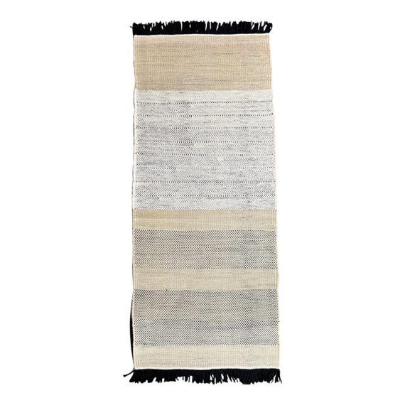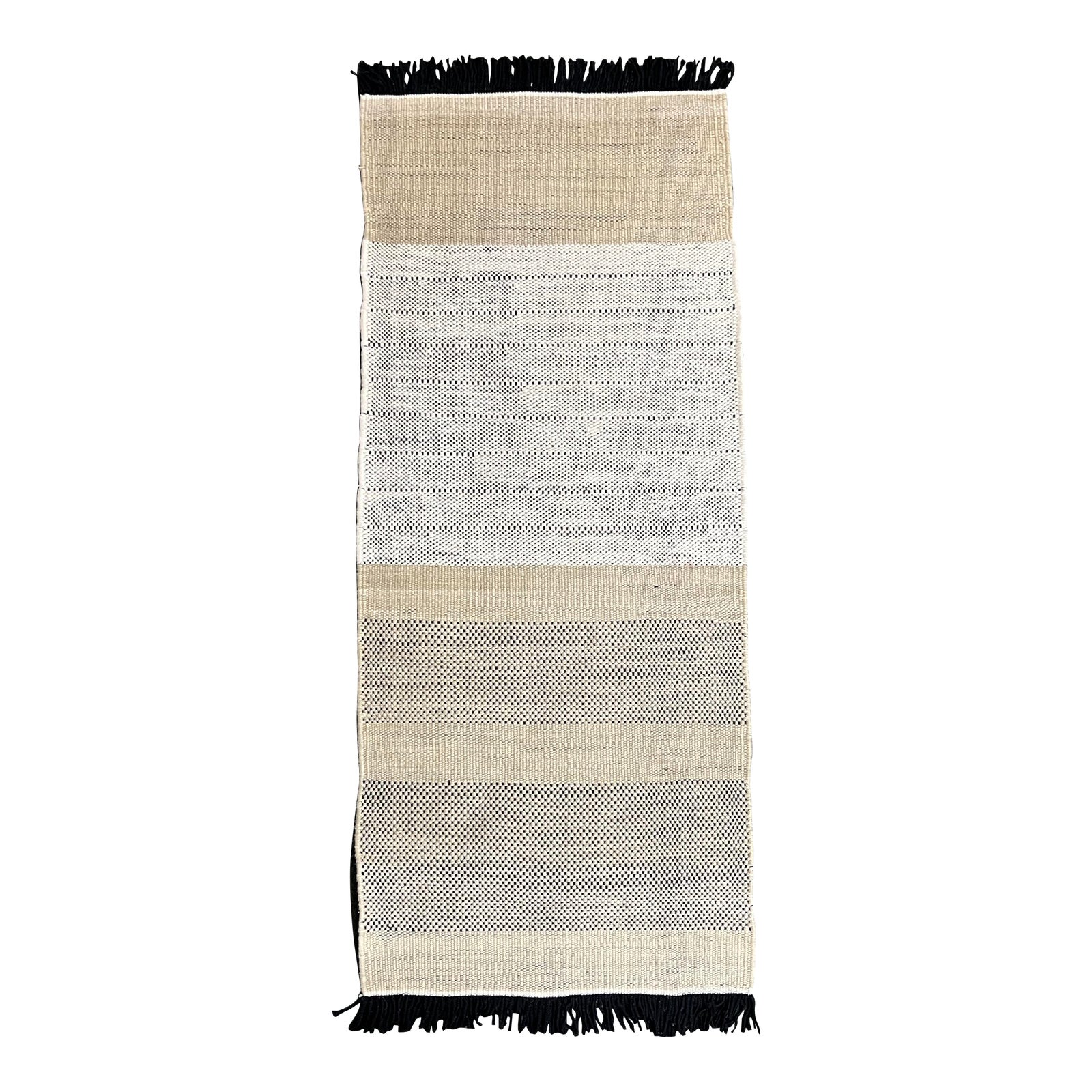 Design Plus Gallery present teh Tres Stripes Runner by Nanimarquina. Handmade of New Zealand wool and felt in a traditional Dhurrie process. The proportion and combination of wool, felt, and cotton generate changes in tone and irregularities in the weave, bringing the organic pattern to life. Long black fringe draws the eye to structure of the weave. Light wear; overall good condtion.