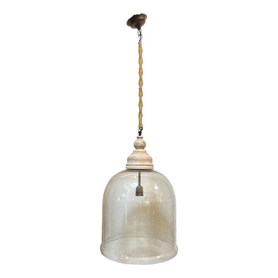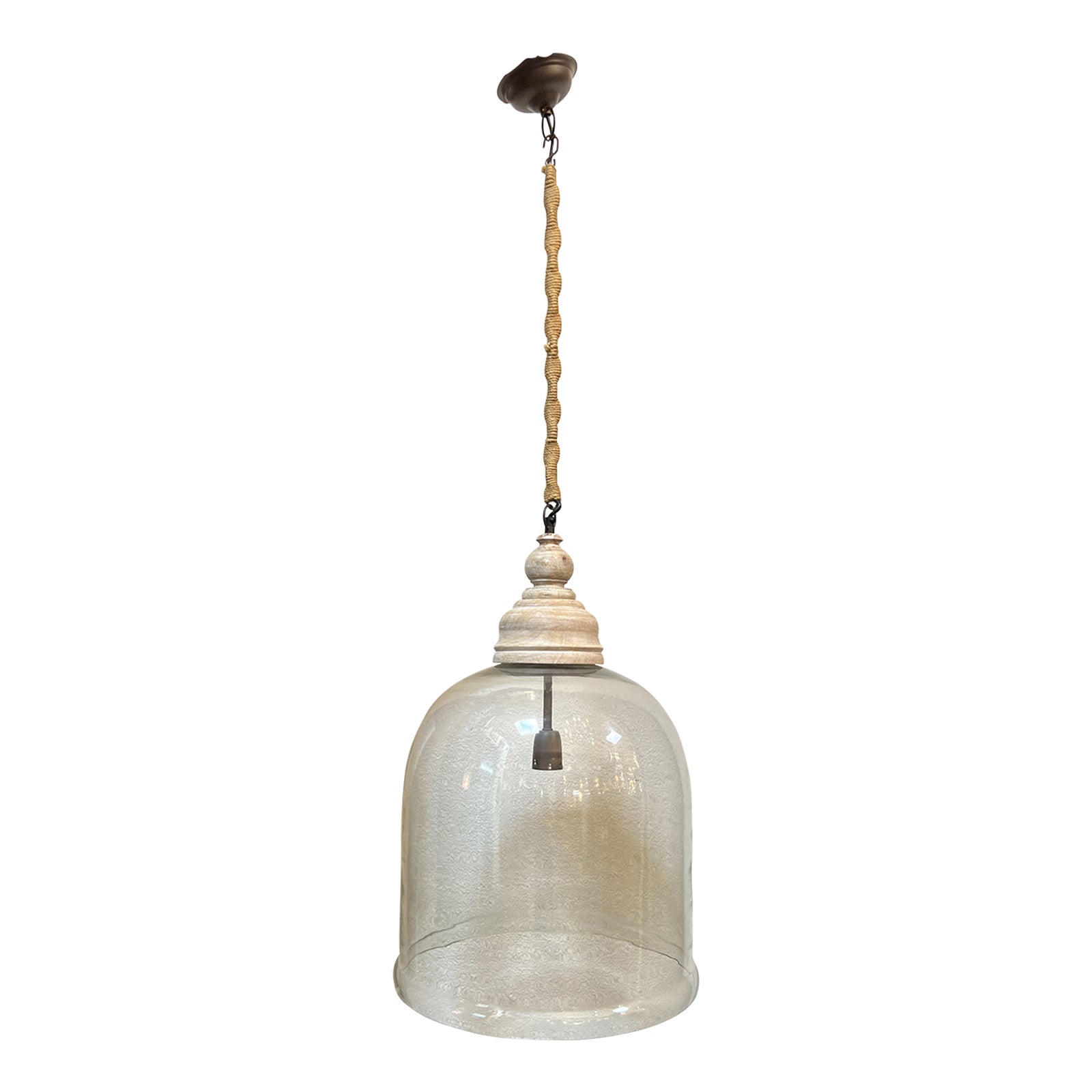 Design Plus Gallery presents the Vintner’s Cloche Pendant by Napa Home & Garden. Charming organic or farmhouse style for your foyer or above a staircase. The turned wood finial, white washed, is suspended from a decorative rope chain for casual look. One 40W bulb, not included. Little evidence of wear; good condition.