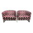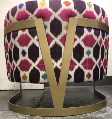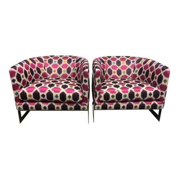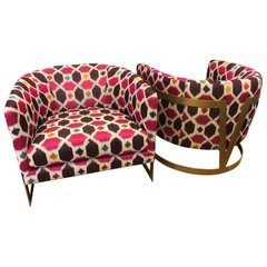 Design Plus Gallery presents a pair of Korz chairs by Tina Nicole for Nathan Anthony. With its stunning V-shaped back and barrel shaped steel frame, the Korz chair, designed by international award winning designer Tina Nicole, appears to be floating. Is the “V” a superhero-symbol? Or something from numerology? Korz gets everyone talking while ooowing and awing. Custom Upholstered in Kravet Couture fabric. minor wear on frame and fabric. Seat height: 18 inches.