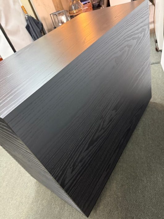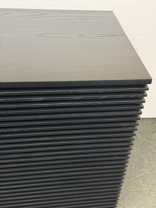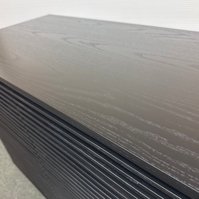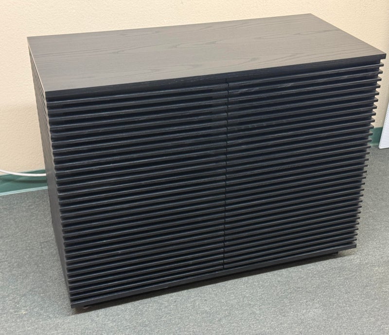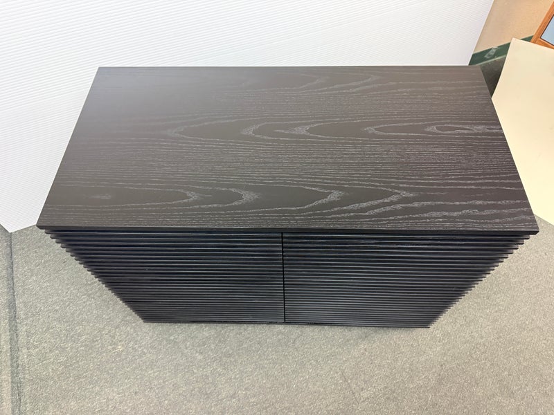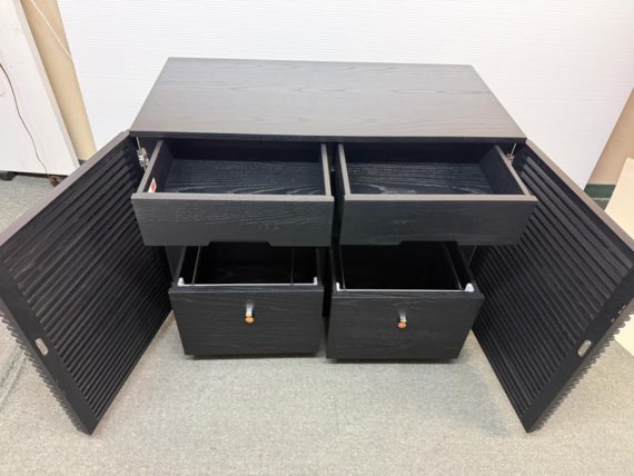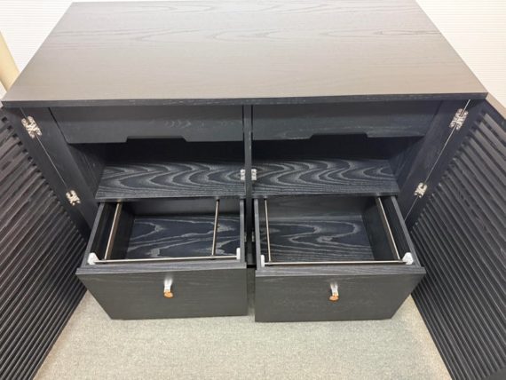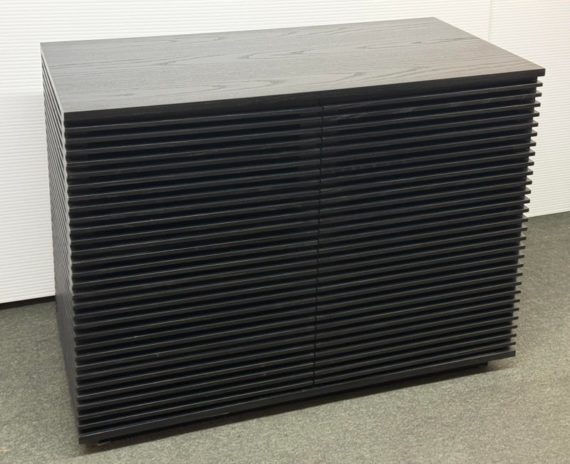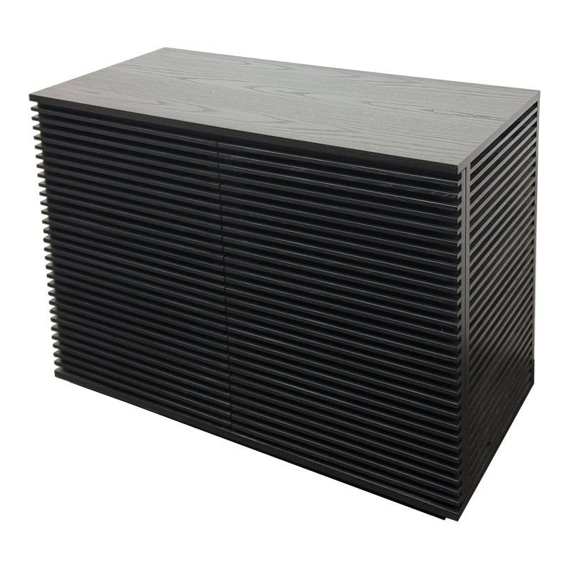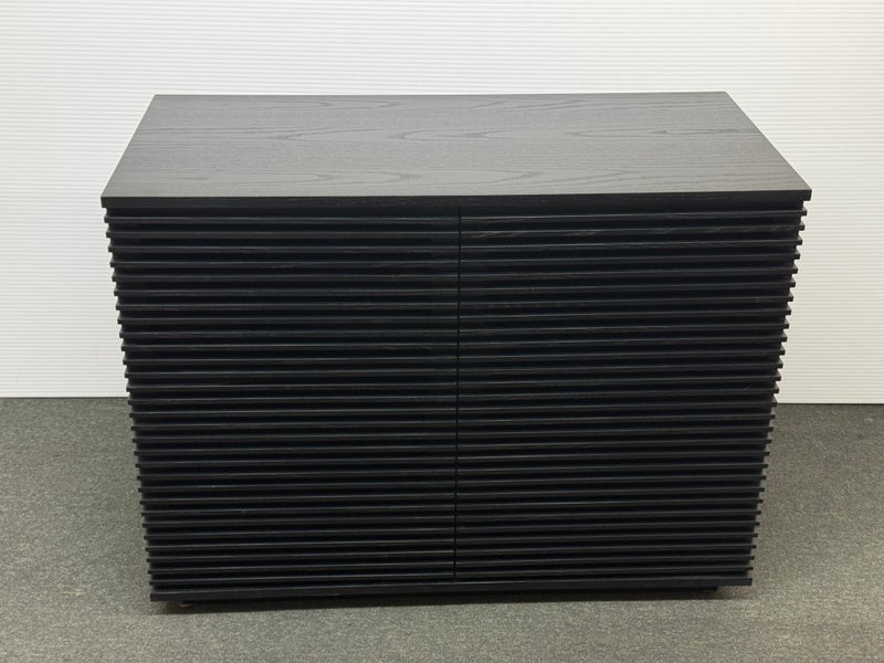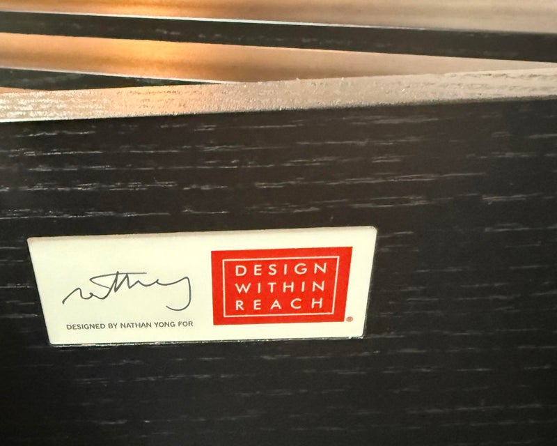 Design Plus Gallery presents a Black File Cabinet from The Line Collection by Nathan Yong for Design Within Reach. Distinguished by horizontal lines that lend a sense of quiet purpose and organization. Bring order to files, accoutrement and even office supplies with two drawers, two open cubbies and two file drawers with leather pulls. Made in Malaysia. Light surface wear; condition is good.