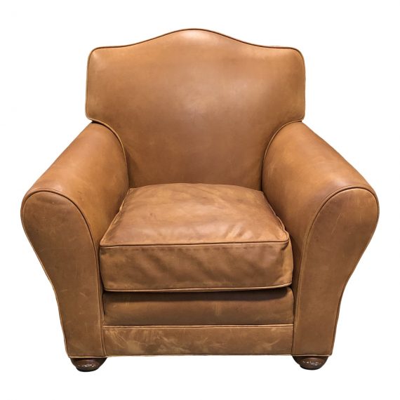 Design Plus Gallery presents a custom Western Club Chair. Crafted by the National Upholstering Company, Emeryville, California. U.S.A. Upholstered in a Cognac Leather. A camel back with flared rolled arms, accompanied with a loose seat cushion. Four wood bun feet. Visible wear with usage. Arm Height: 24.5 inches, Seat Height:19 inches.