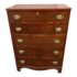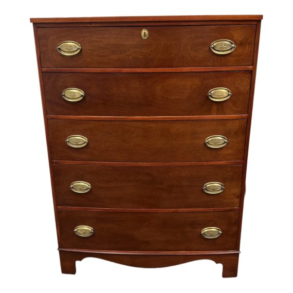 Design Plus Gallery presents a Vintage Highboy by National Furniture Company of Mt. Airy, NC. A classic bow front tall chest of drawers, the cabinet is crafted of mahogany and veneers. Decorative brass pulls with foliate motif and shallow curved apron are the only embellishments. Visible surface defects, condition consistent with age and use.