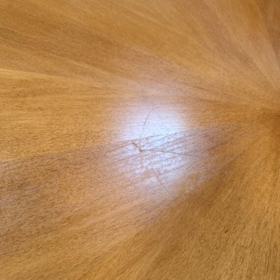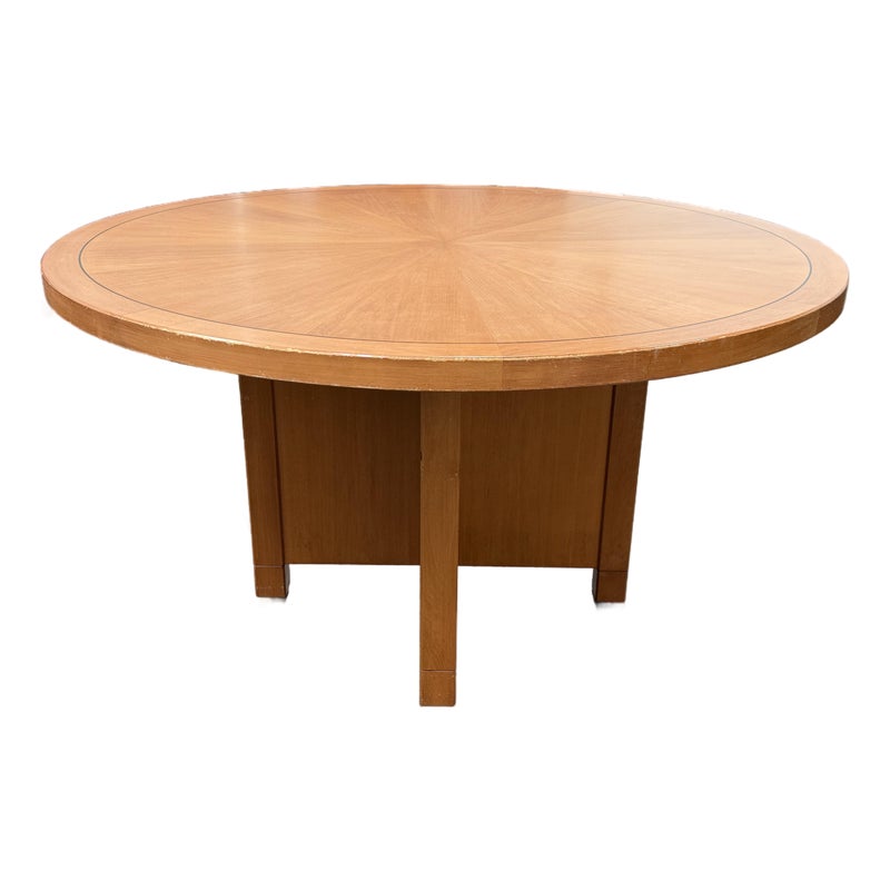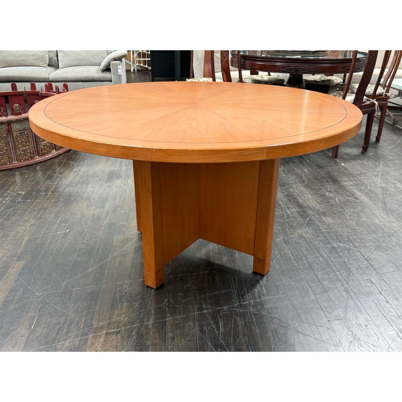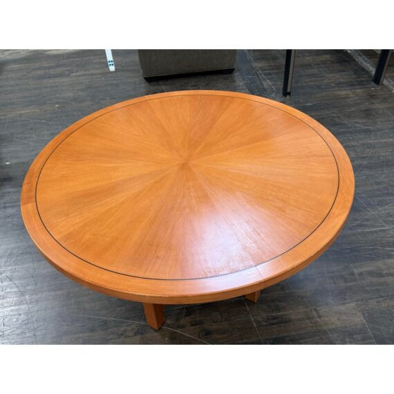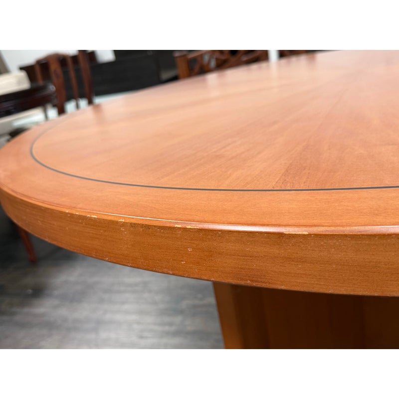 Design Plus Gallery presents a Custom Made Conference Table with a Natural Cherry Wood Finish. Furnish your small business and office spaces with this style table for a great meeting of the minds, collaborating table. The table promotes communication and this cherry finish looks great. Overall the table is in good condition with visible chips and wear to the surface veneer finish.