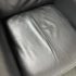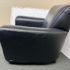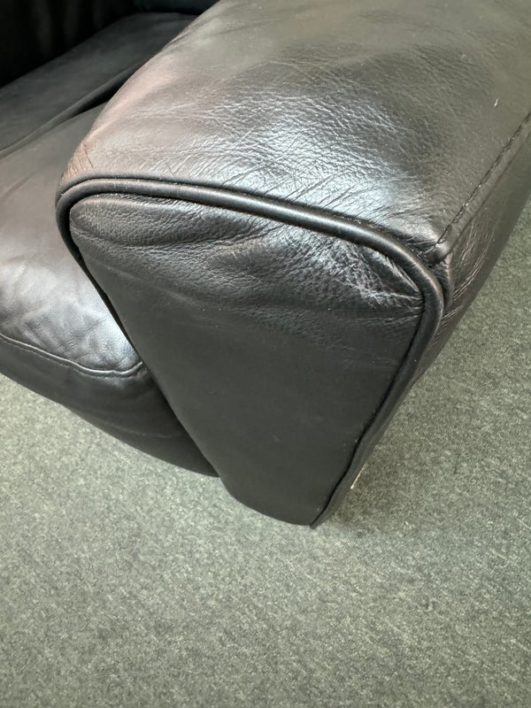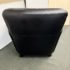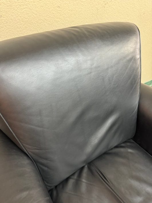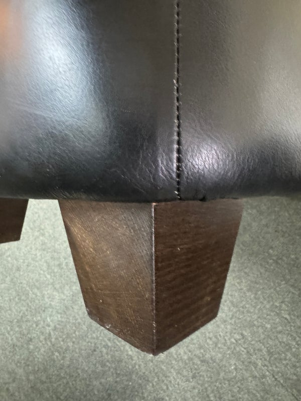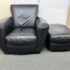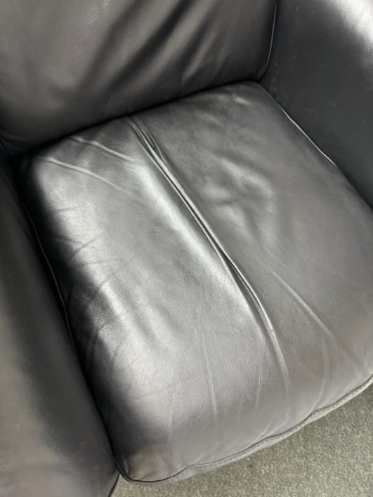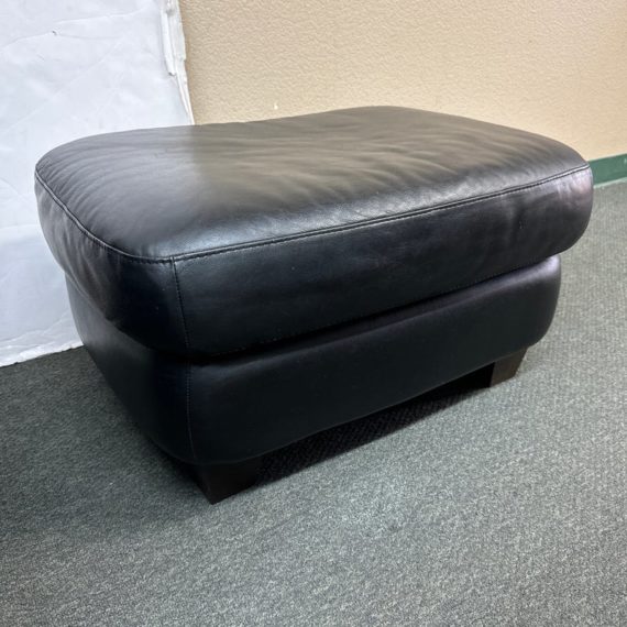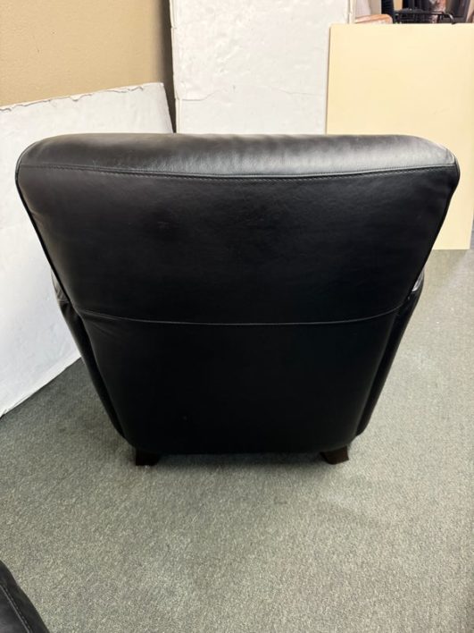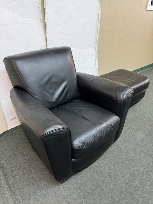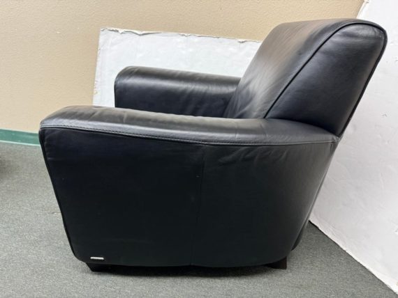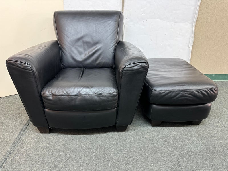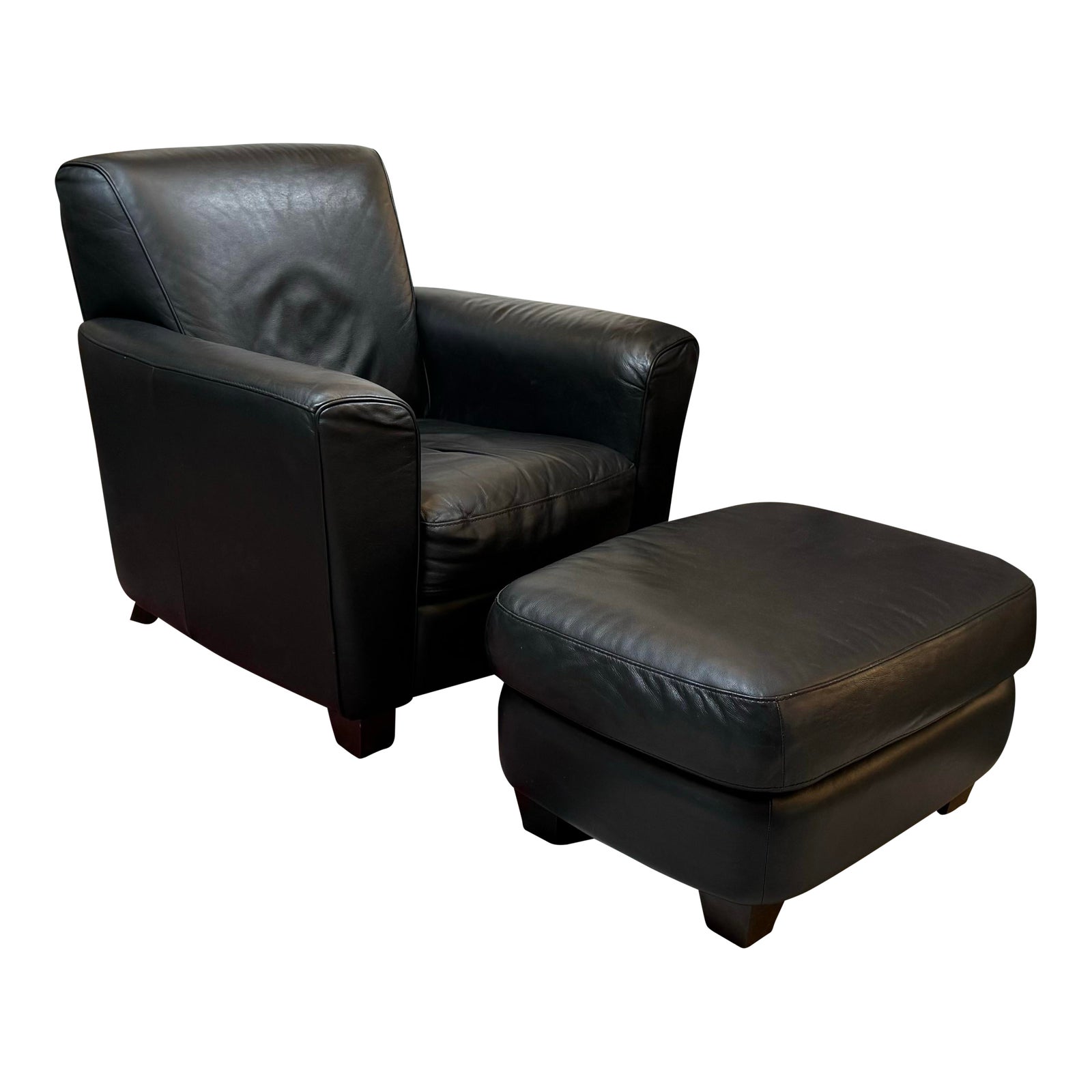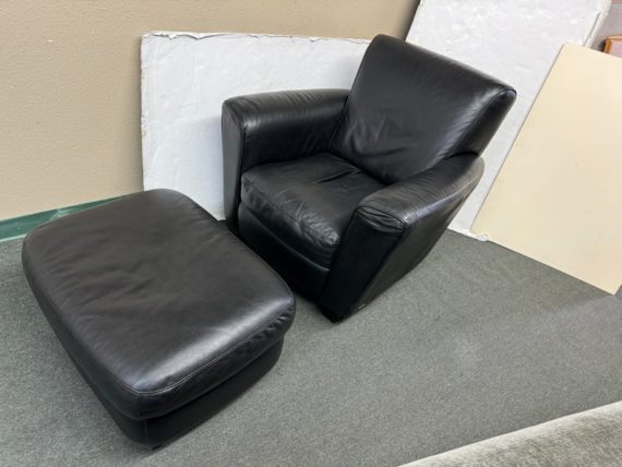 Design Plus Gallery presents a Natuzzi Club Chair + Ottoman. Contemporary clubby style, the clean silhouette of chair and ottoman is wrapped in luxe black Italian leather, and finished with a self welt. Elevated slightly on dark tapered legs. Light surface wear; leather stretched as shown; condition is good for age and use.