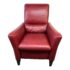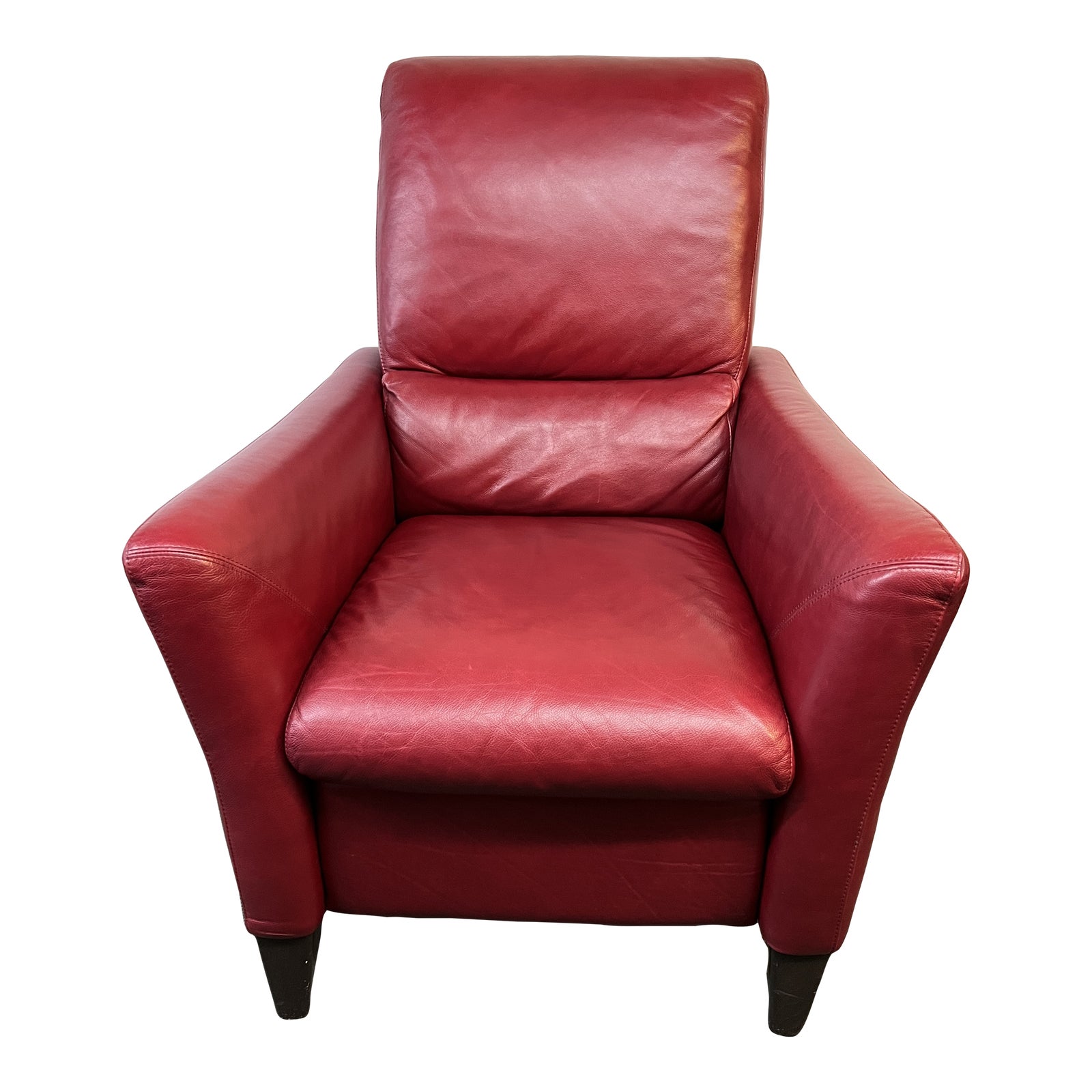 Design Plus Gallery presents a Ilaria Leather Recliner by Natuzzi. This push back contemporary recliner is beautifully scaled with narrow flared arms but roomy seat cushions, and is wrapped in luscious red Italian leather with decorative stitching. Simple dark stained tapered legs elevate the chair. Light evidence of wear; small marks on Leather consistent with age and use.