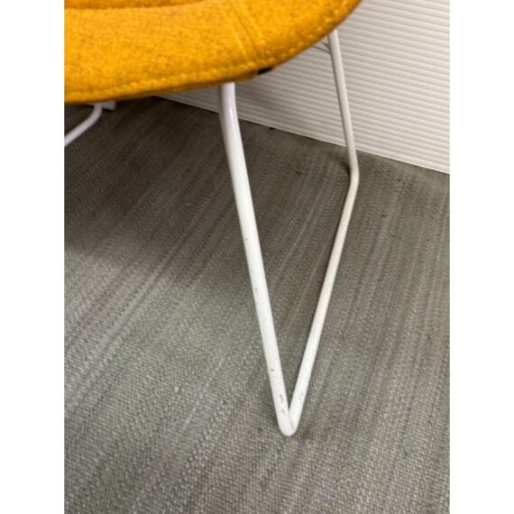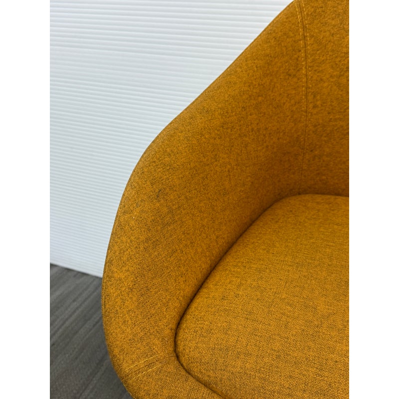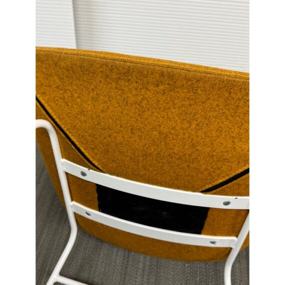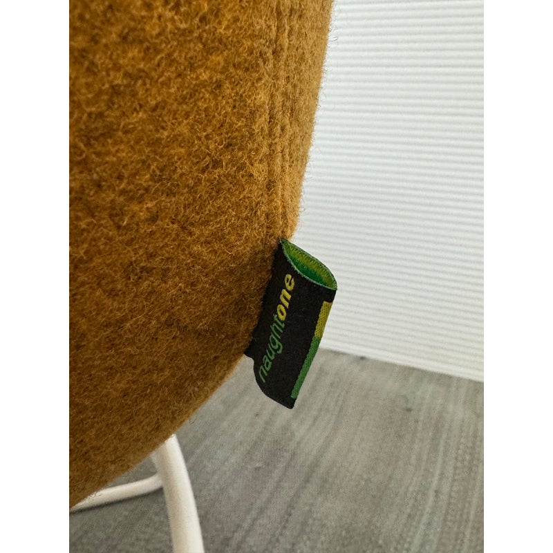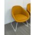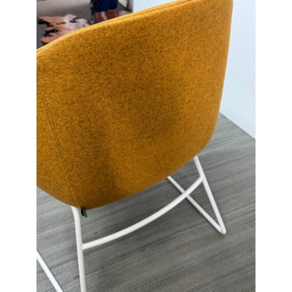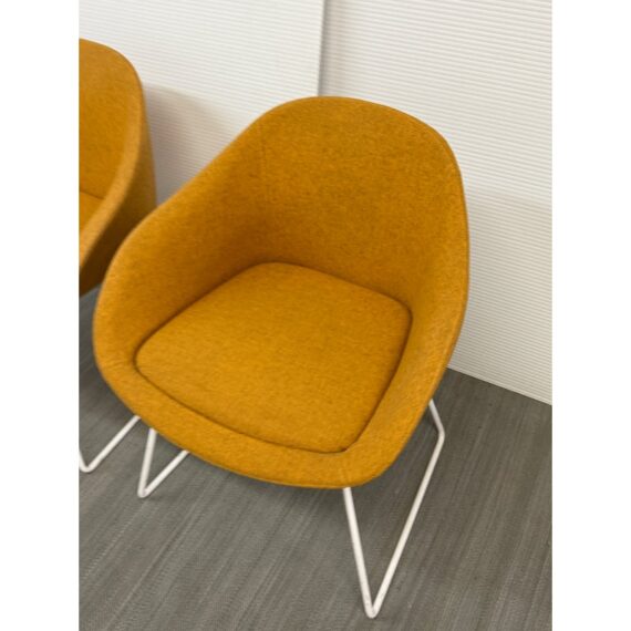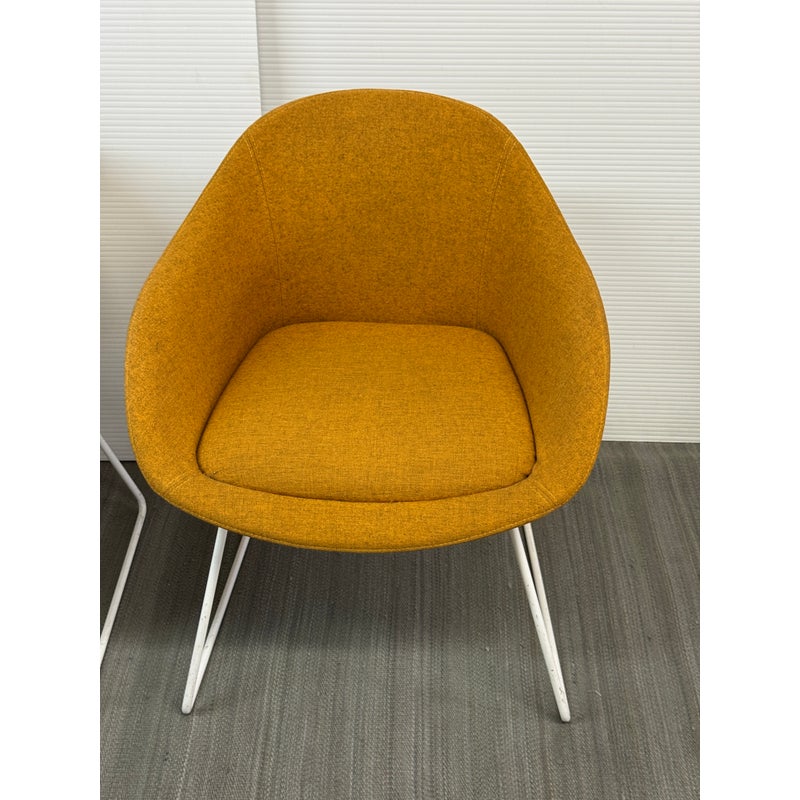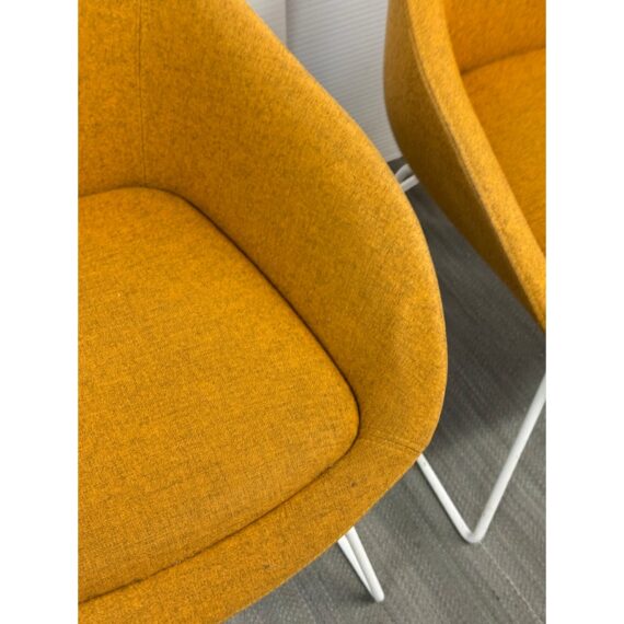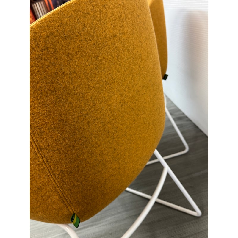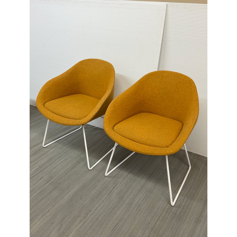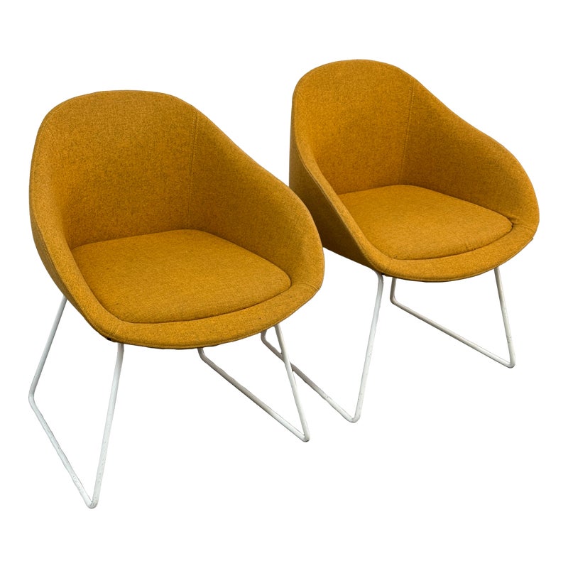 Design Plus Gallery presents a Pair of Always Chairs by NaughtOne. Featuring enduring good looks, the pair will fit in anywhere. Simple, rounded contours with an organic form that is naturally enveloping, with a positive back support for supportive comfort. Meticulously tailored upholstery in a warm Broom Yellow hue and elevated on white powder coated sled base. Light wear; one arm support is broken (shown).