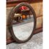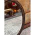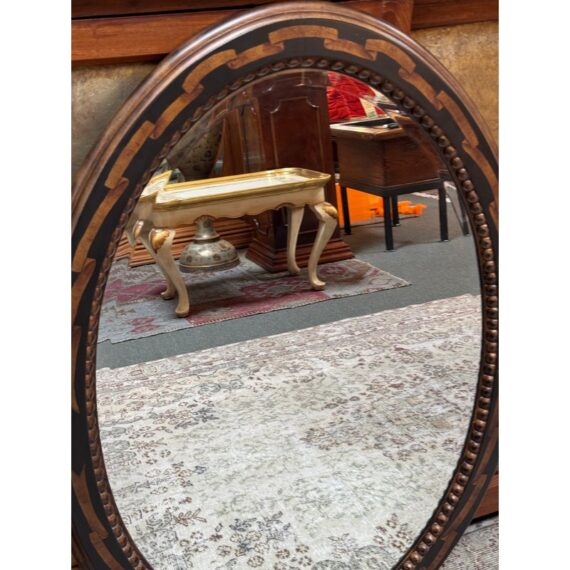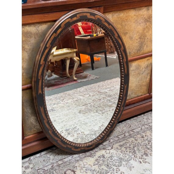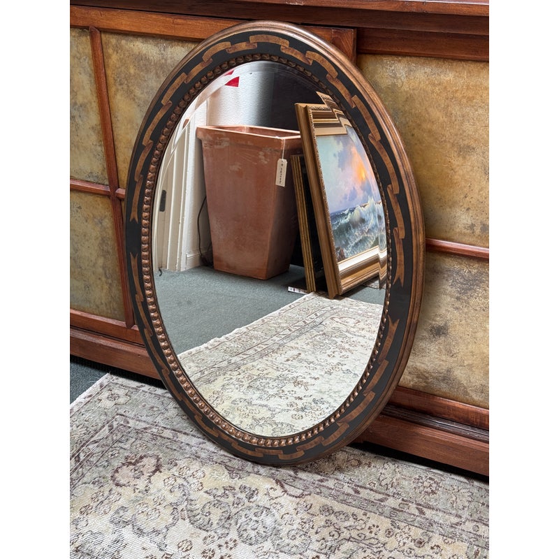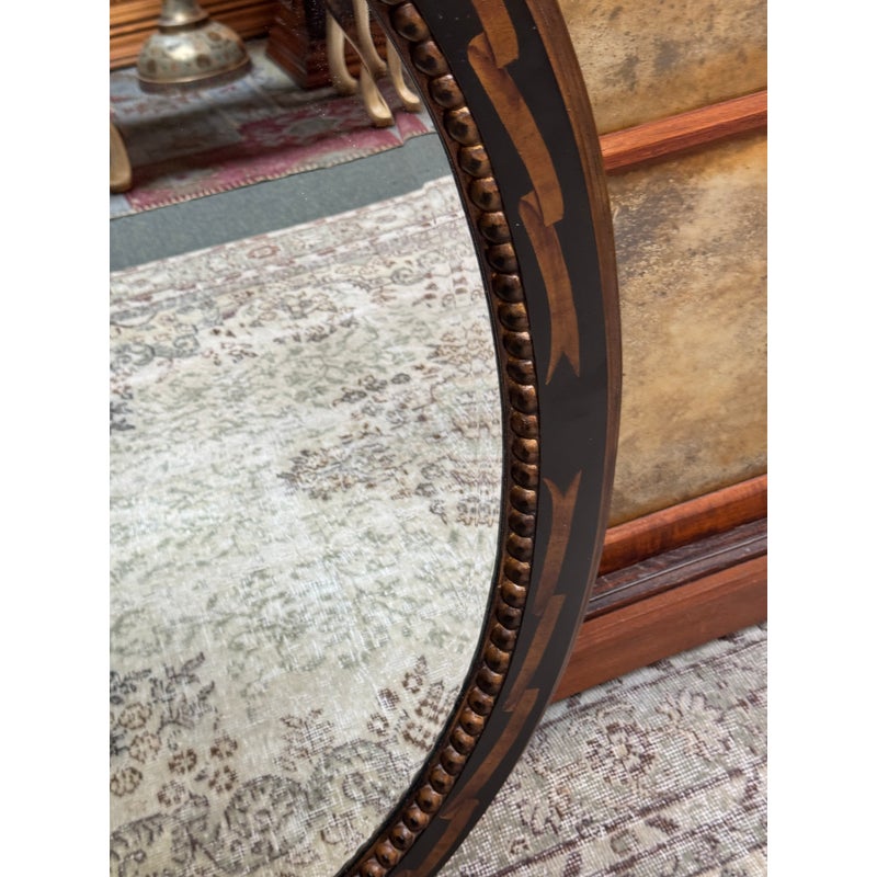 Design Plus Gallery presents an Inlaid Burl Wood Wall Mirror with Neoclassical Style. The beveled edge mirror is inset an impeccable frame that was hand crafted and one of a kind. The mirror is next to a dimensional beaded trim interior, and the exterior is rounded all in a dark, marbled burl wood. Between the beads and rounded edge is a thick panel of black that has two symmetrical ribbons wrapping around the piece in same tone of burl wood. It is a wonder to marvel at yourself or the artistry, your choice. It is in good condition with minimal signs of wear.