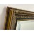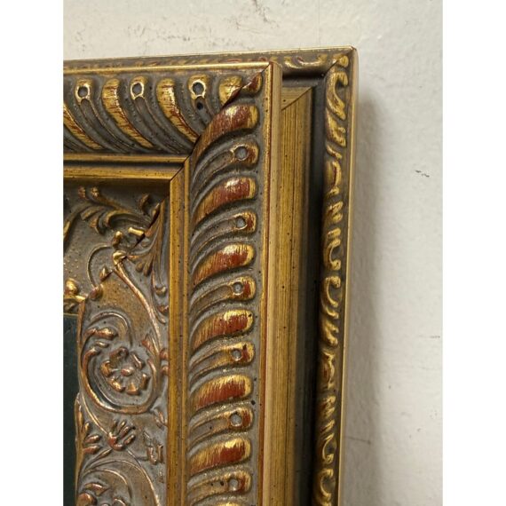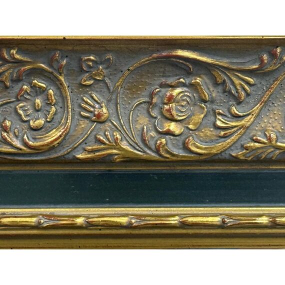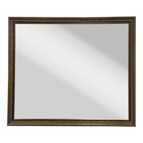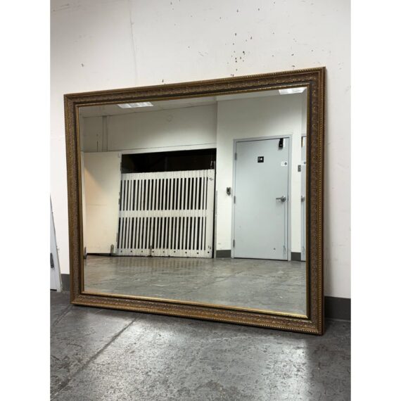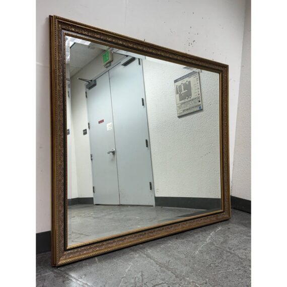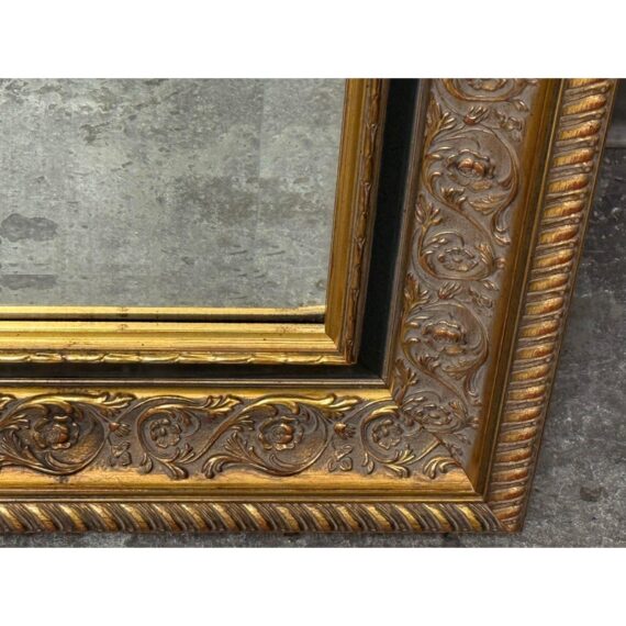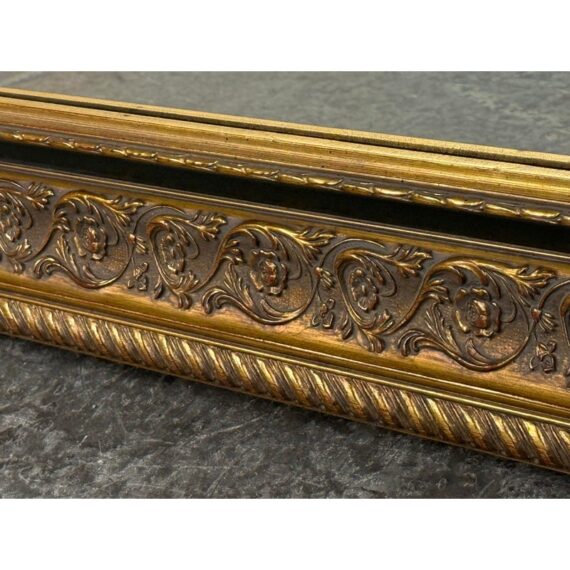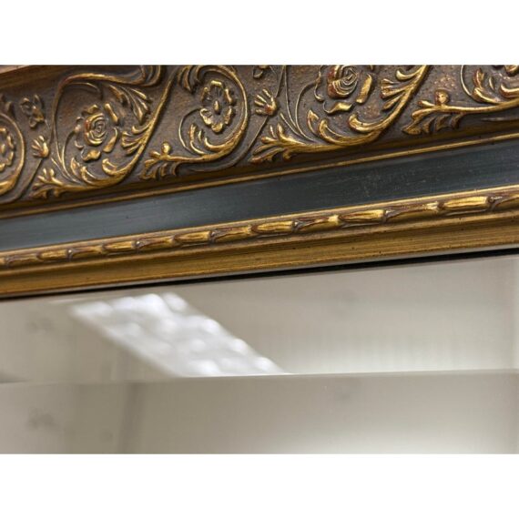 Design Plus Gallery presents an Over the Mantle or Leaning Floor Wall Mirror of Neoclassical Style with an Oversized Shape. The frame is considerably ornate with many different textures cast into its layers. The large mirror that is inset is beveled. There is a hanging bar on top of the horizontal layout to secure it to the wall. It is in good condition, visible and minimal wear from usage.