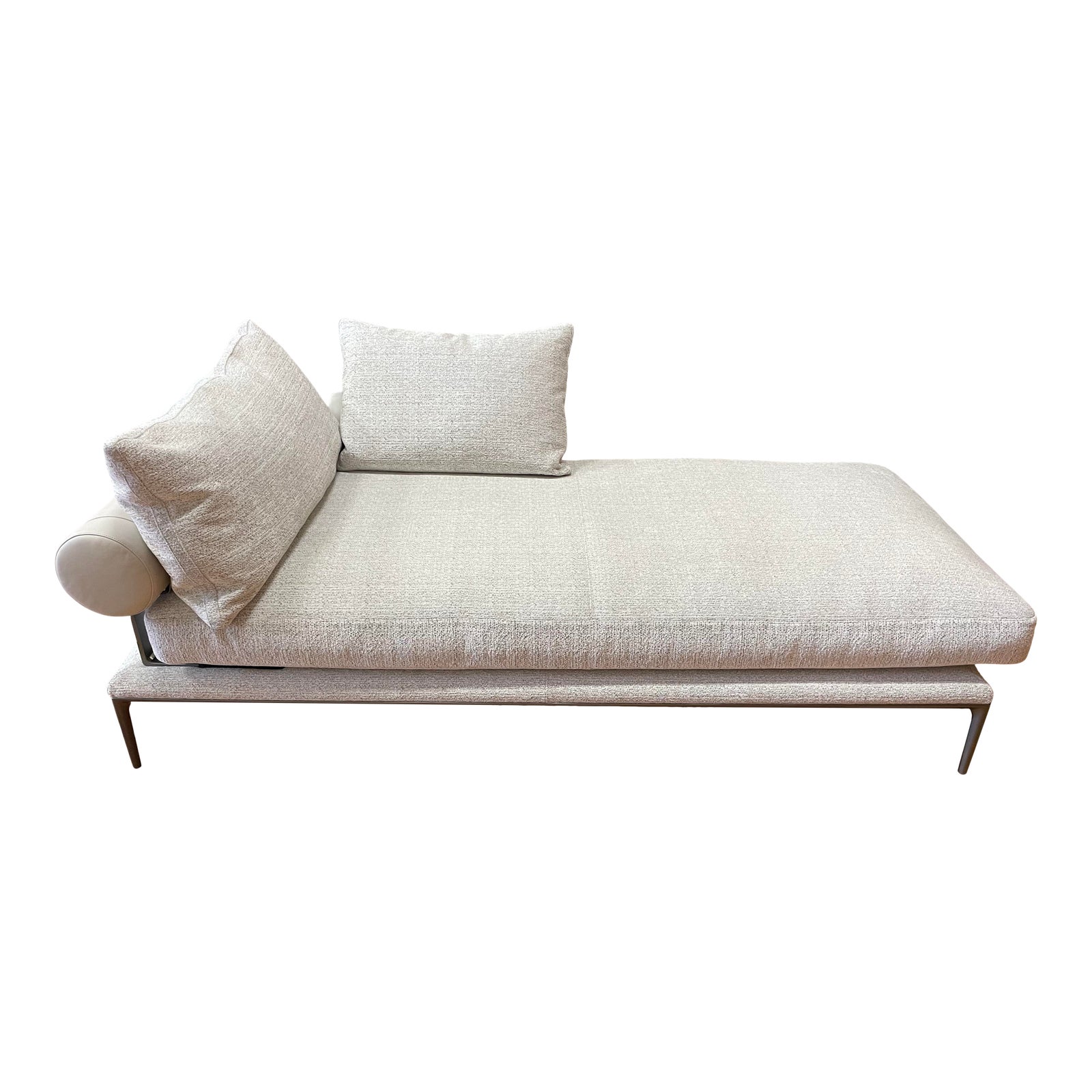 Design Plus Gallery presents a New Atoll Daybed by B&B Italia. The beautiful chaise was upholstered in the “Elletra” Fabric. The fabric is a white and gray flecked chenille tweed and feels soft to touch. The hardware is pewter finish. The chaise comes with two cushions and bolsters. Named after the coral formation, the modular sofa system B&B Atoll is a refined expression of a balanced aesthetic form and a decisive contemporary style that is also extremely elegant. Headrests are removable and adjustable. This luxury day bed is in good condition.