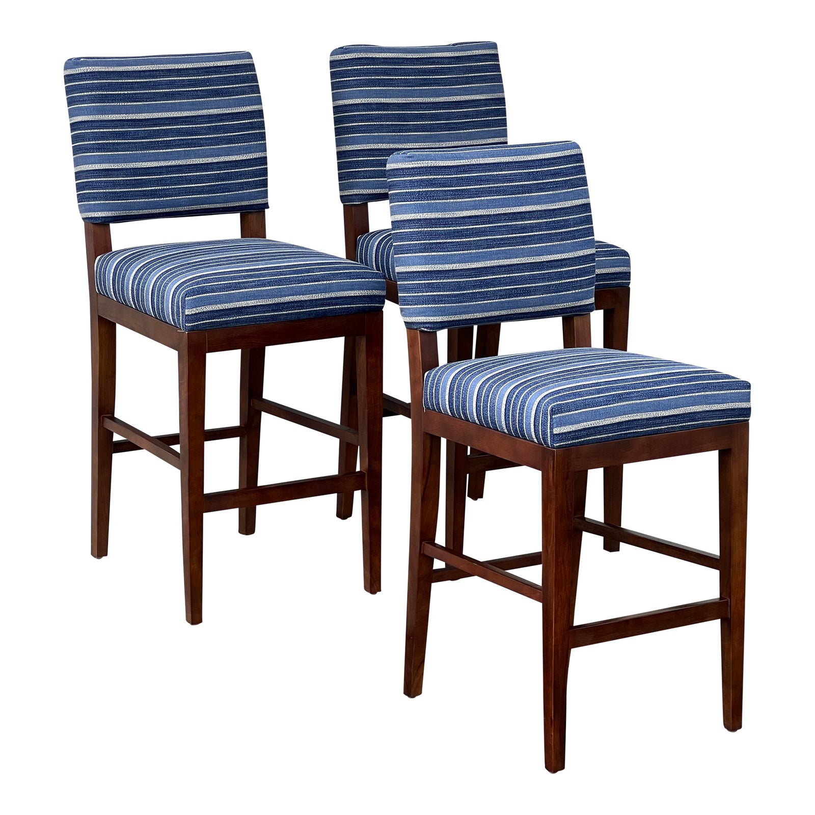 Design Plus Gallery presents a Set of 3 Cabo Bar Stools. The simple silhouette is crafted of praline stained teak. The blue and off-white stripe Performance upholstery wraps cushioned seat and back. Made in Indonesia. Little evidence of wear; condition is good for age and use.
