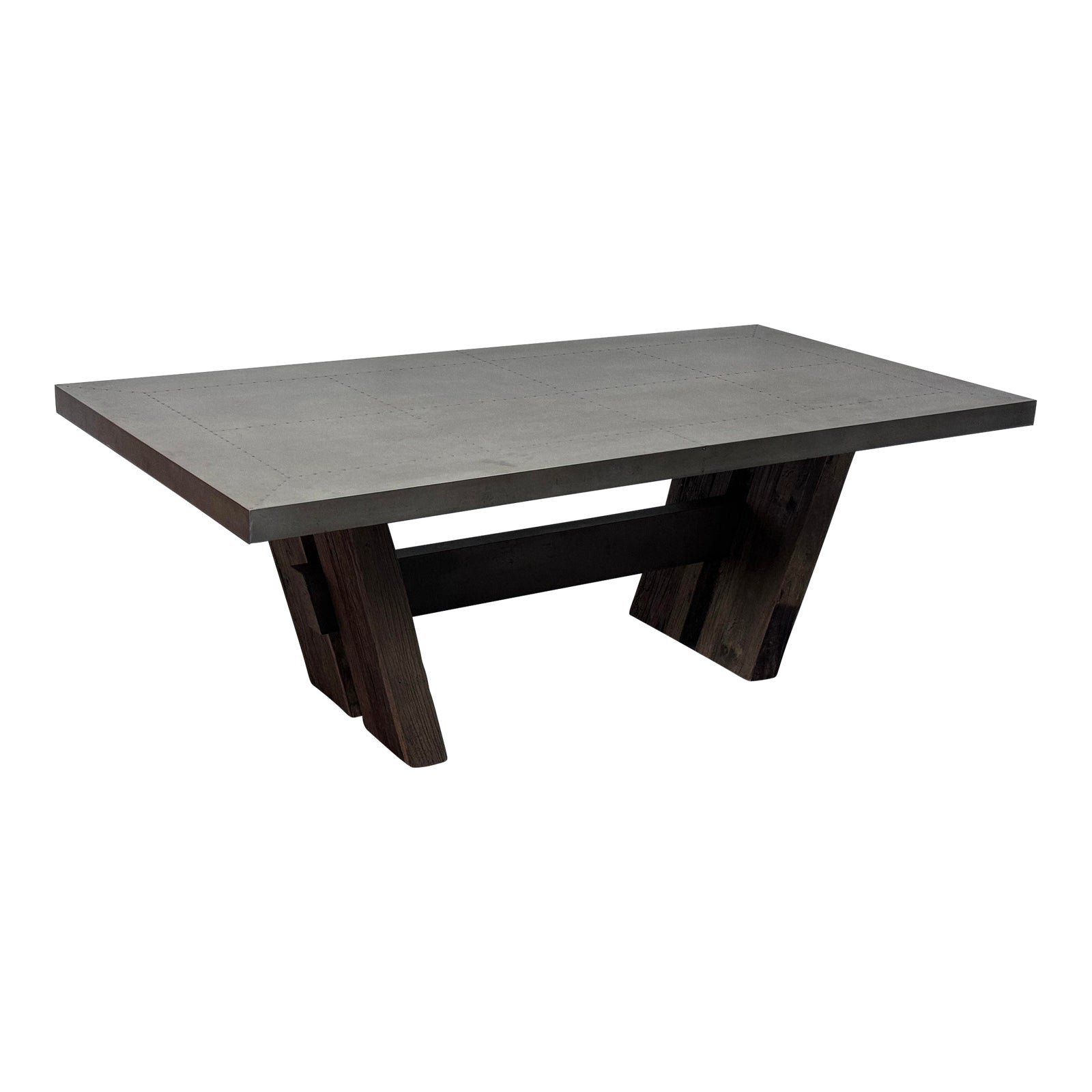 Design Plus Gallery presents a Galvanized Dining Table by Brownstone Furniture. The dining table is a stunning combination of rustic charm and modern industrial aesthetics. Its rectangular shape and sturdy oak reclaimed wood base lend a sense of timeless elegance, while its unique design elements set it apart from traditional dining tables. The base of the table features inwardly slanted legs, adding a visually dynamic touch to the overall design. These legs are connected by a sturdy beam. The table top is adorned with a striking metal wrap-around with nail heads, adding an eye-catching industrial twist. This combination of materials and finishes gives the dining table a unique and edgy vibe that will effortlessly enhance any dining area’s decor. Visible and minor wear. In good condition. This is a discontinued model. Made in China.