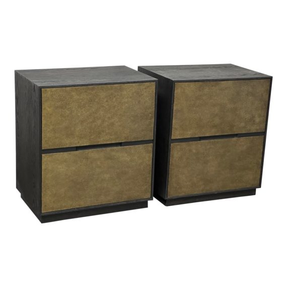 Design Plus Gallery presents a Pair of Eporedia Night Stands by Cavalletto Home. Clean lines and textured surfaces highlight the Eporedia collection’s maximal-minimalist approach. Using cast aluminum brings depth, dimension, and richness to metal draws fronts. The slender profile is a timeless silhouette, elevated on plinth base. Minor wear, showroom sample condition.