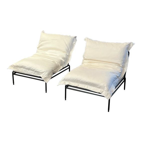 Design Plus Gallery presents a Pair of Plush Pillow Ivory White Lounge Chairs, Designed by Kara Mann for CB2. Black finish iron tube framing with large white down fill cushions in white cotton/linen blend. They’re laid back design is perfect for lounging in a covered patio/gazebo and even in a game room. Both are in good condition with wear that is consistent with age + use.