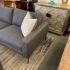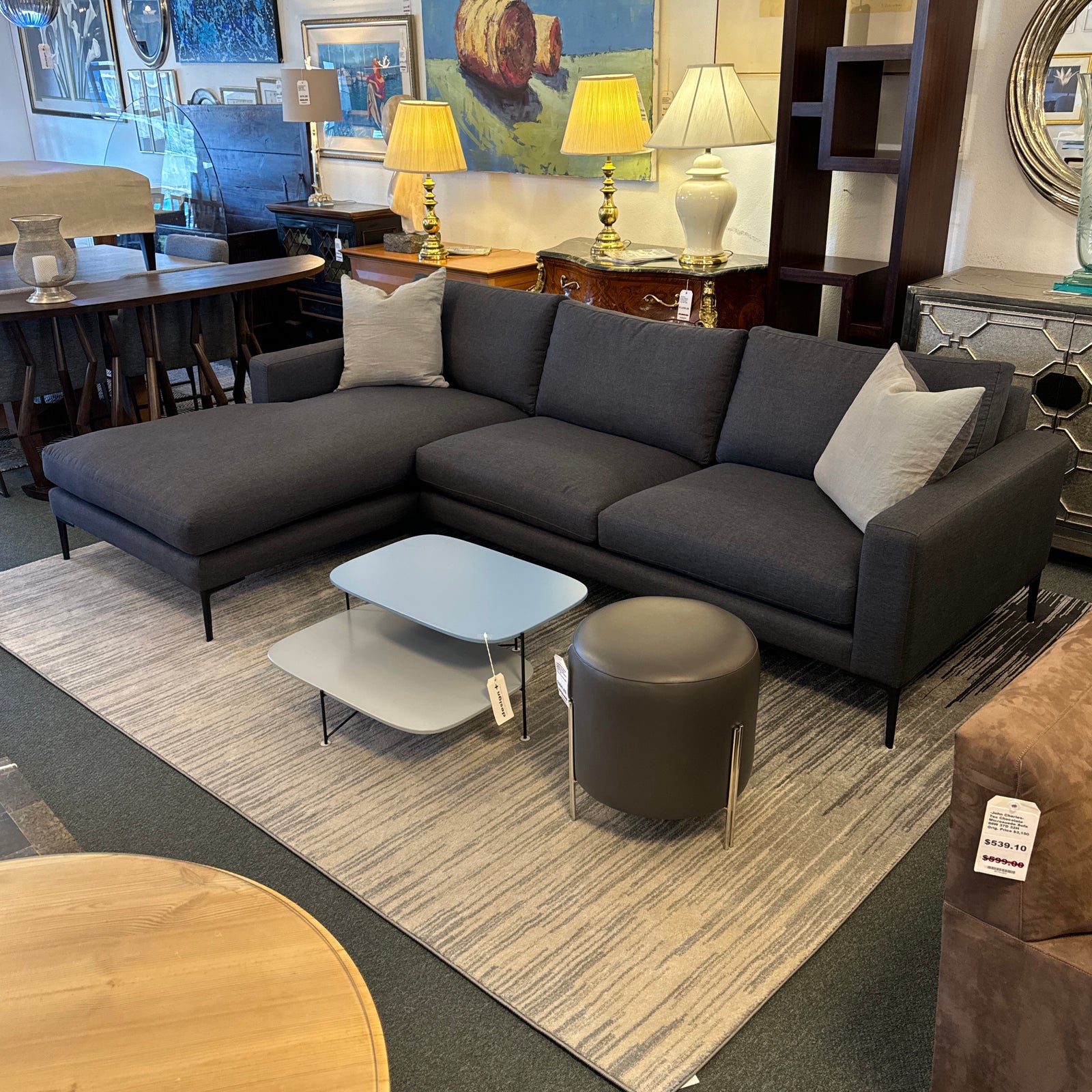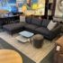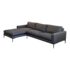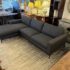 Design Plus Gallery presents a Custom Made Two Piece Grey Sectional. Contemporary silhouette in a timeless style, the 2pc Sectional invites lounging. Charcoal performance (good for pets, not UV resistant) upholstery envelopes loose, plush, synthetic cushions on seats and chaise. The alder-framed sectional is elevated on dark metallic legs that taper elegantly. Custom made in the USA. Minor wear; sectional is in good condition.