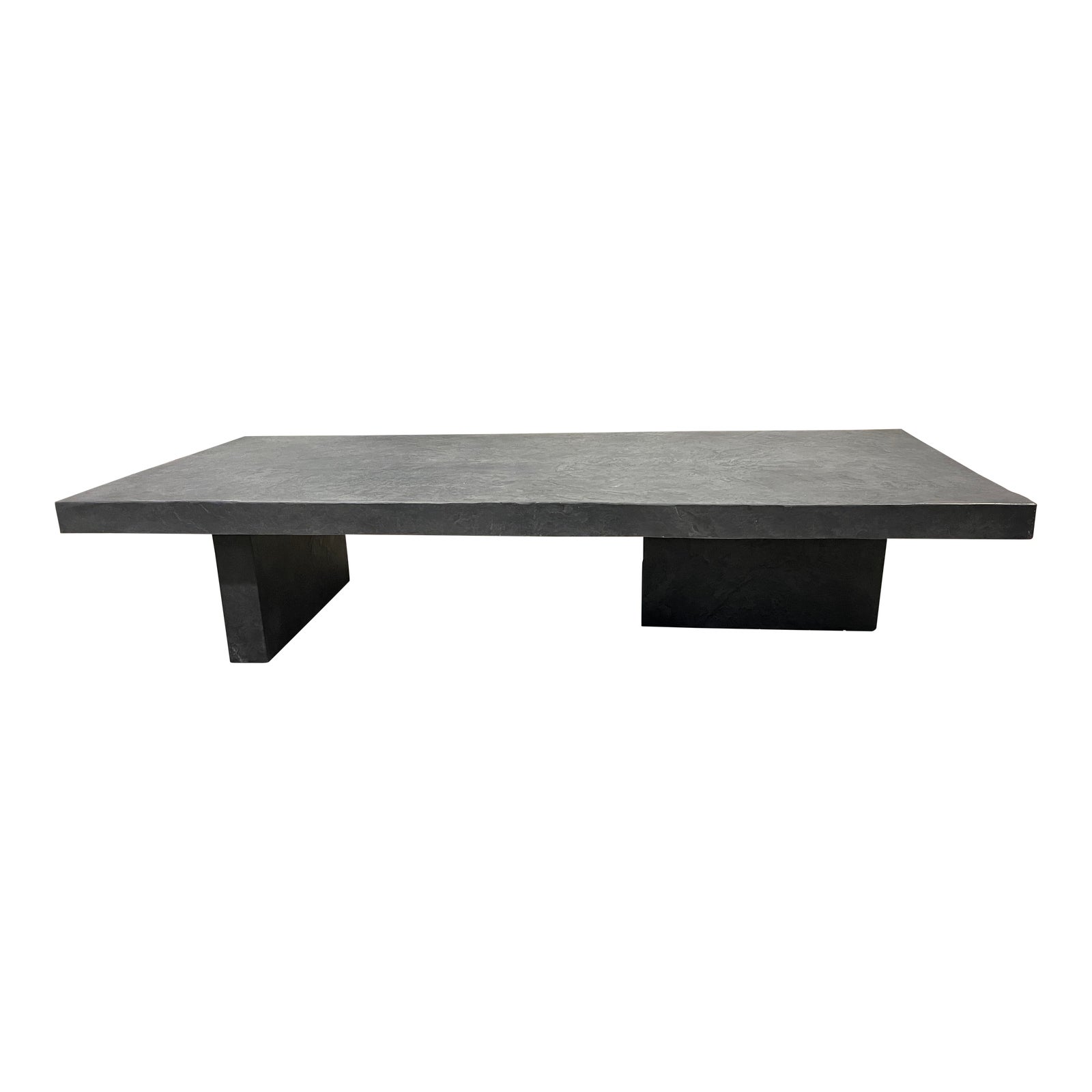 Design Plus Gallery presents a NEW Custom Design Foundry Stone Faux Finish Coffee Table. Modernist clean lines harkens back to a Carlo scarp aesthetic with a Brutalist organic quality in the textured stone like surfaces. Side table is finished with a gray and slightly blue/green stain. Minor wear through out, side table is in good condition.