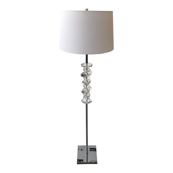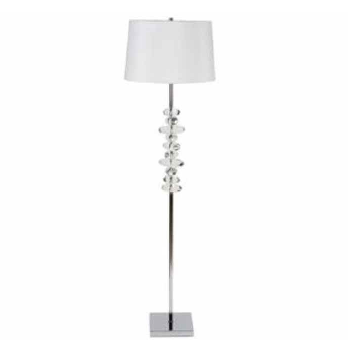 Design Plus Gallery presents a New London Floor Lamp by Flow Decor. The contemporary floor lamp is embellished with crystal on the chrome finished center rod. Topped with a white tapered drum shade and cylindrical chrome finial. 3-way switch, 150W