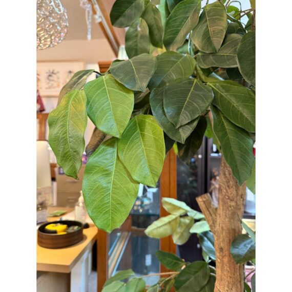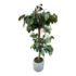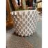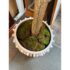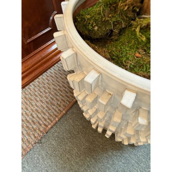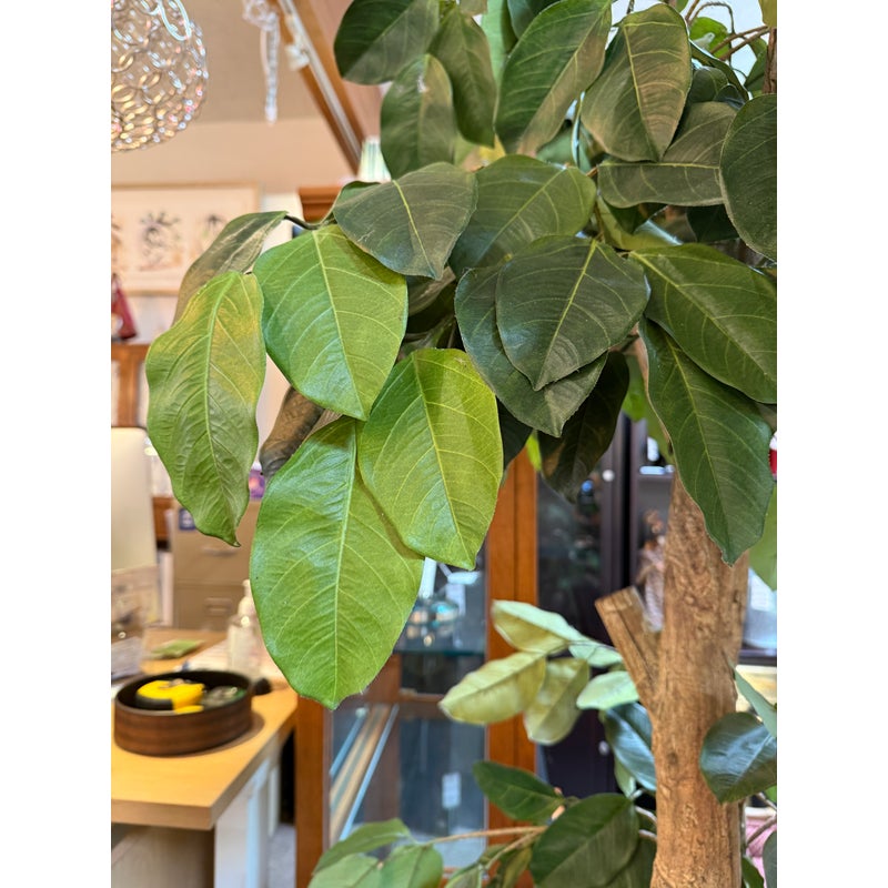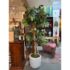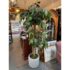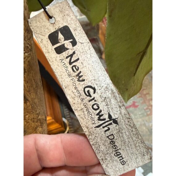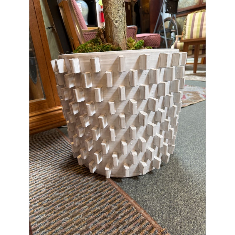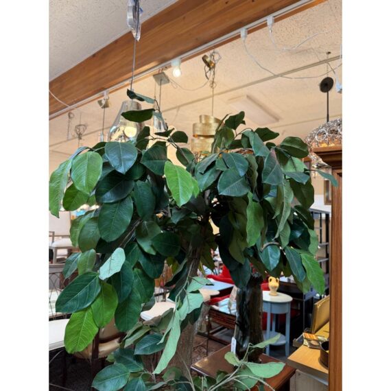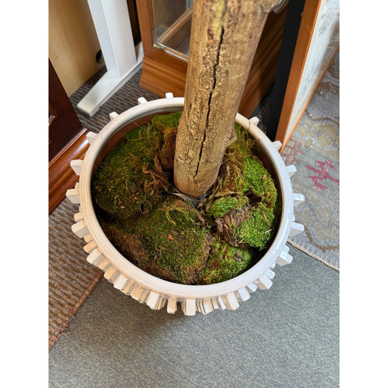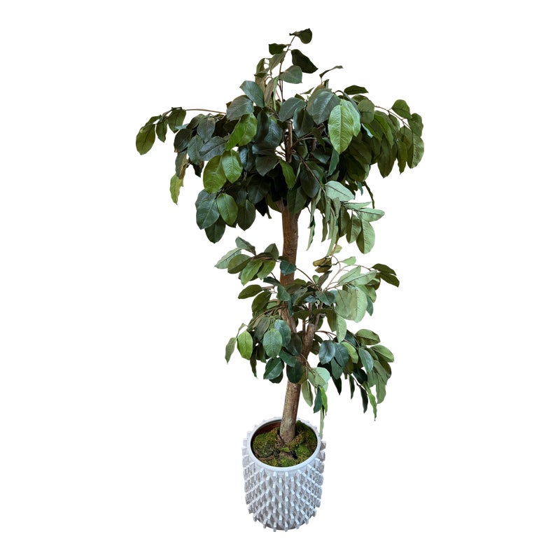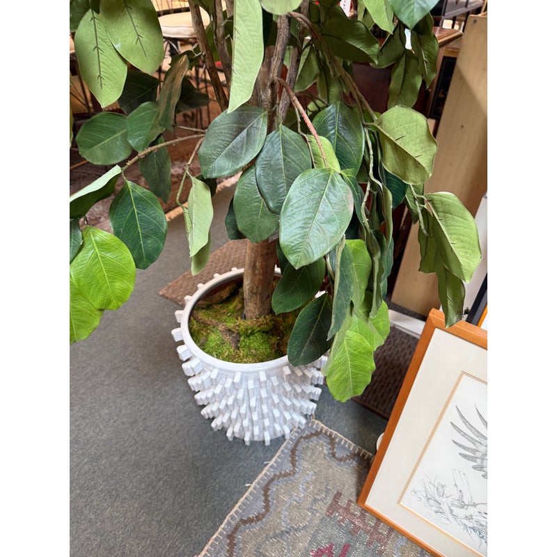 Design Plus Gallery presents a Faux Banyan Tree from New Growth Design. A naturalistic trunk layered green foliage, and a white ceramic pot detailed with an allover raised geometric pattern. The scale and silhouette give the piece strong visual presence, while the moss-covered base adds texture and depth. The leaves show tonal variation and veining that enhance the realistic look of the overall form. It is in good condition with visible and minimal wear from usage.