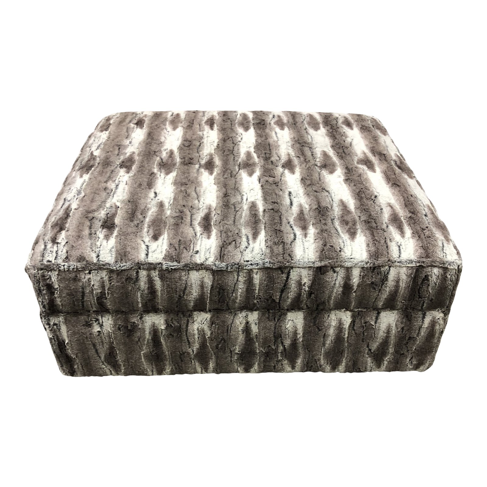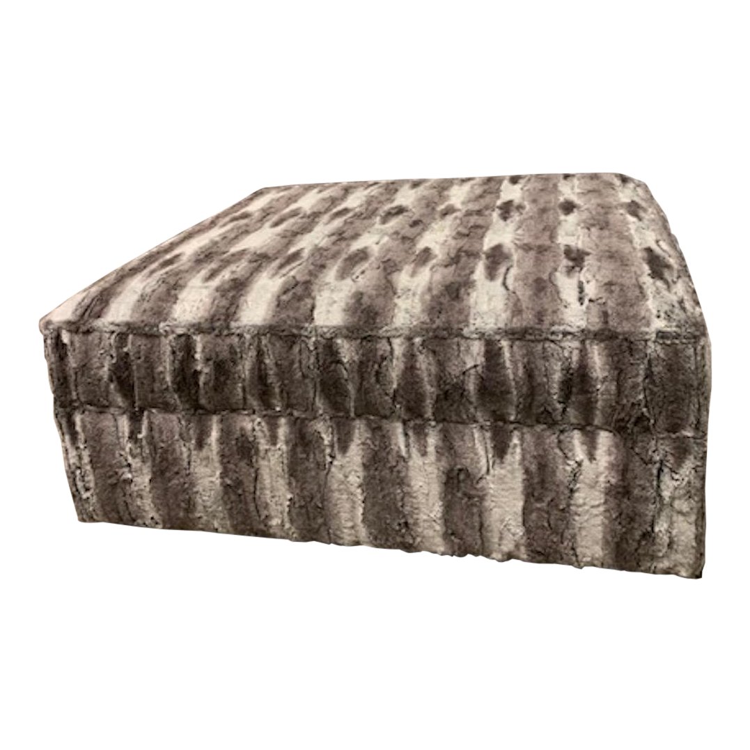 Design Plus Gallery presents a Greenwich Custom Ottoman by Henredon. Straight from a San Francisco Designer Showroom. Upholstered in a soft faux fur fabric. The base gas four brass finish metal casters.