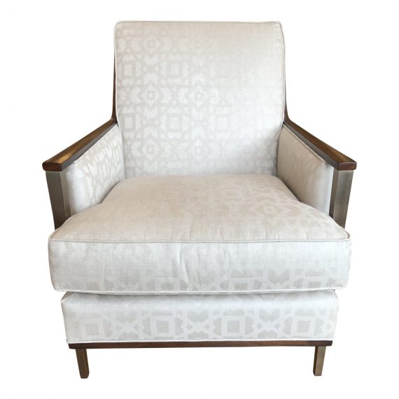 Design Plus Gallery presents a NEW Référence Patrick Chair by Henredon. Originally designed by Patrick Aubriot. Straight from a San Francisco Designer Showroom. Features a foam blend-down removable seat cushion and upholstered back. A mini welt trim. The frame has wood arms and top detailing in a dark walnut finish. The legs are brushed metal tapered front with decorative back legs. Upholstered in a off white geometric pattern fabric. Arm Height: 26 inches, Seat Height: 20 inches.