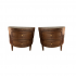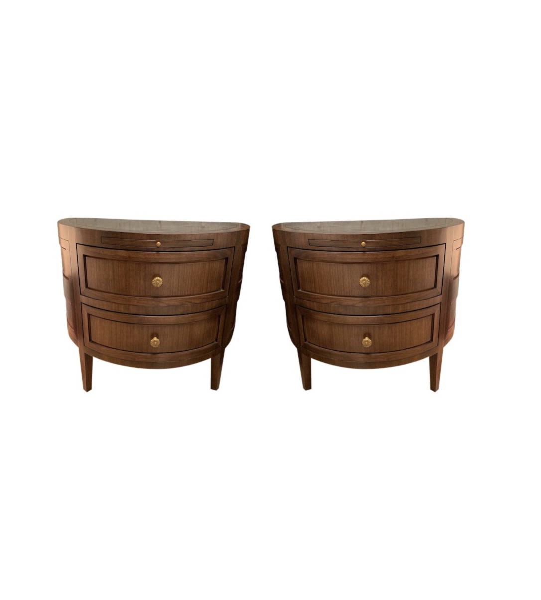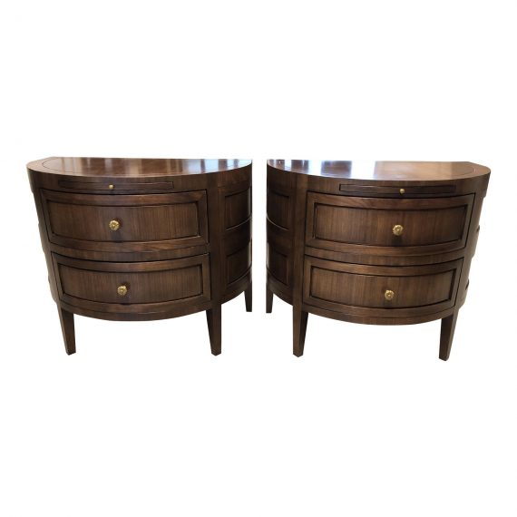 Design Plus Gallery presents a brand new pair of Demilune Chest by Hickory Chair. Designed by David Phoenix. Straight from a San Francisco Designer Showroom. Features handsome raised panel drawers accented with antique brass knobs. It is a perfect storage companion beside the bed with its accommodating pull out shelf. Made of walnut.